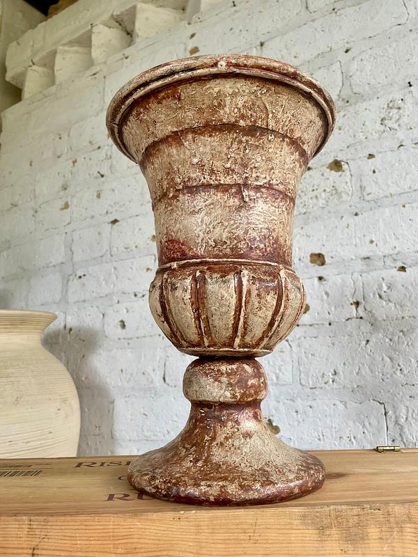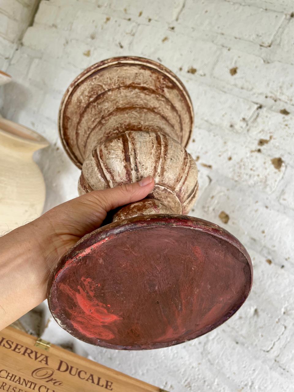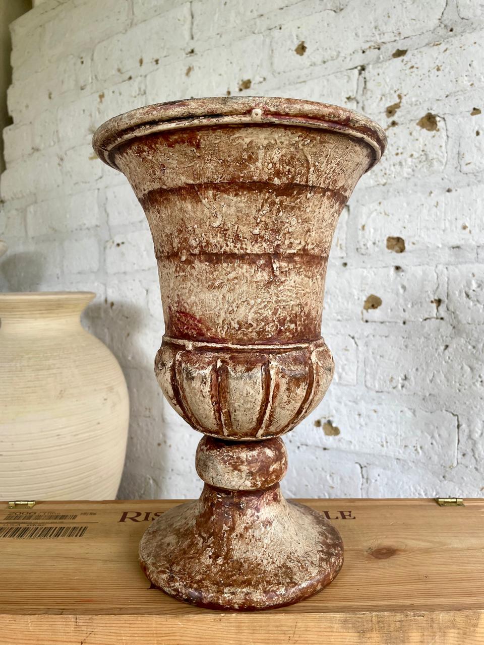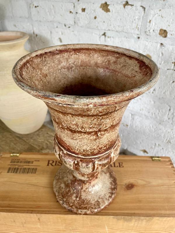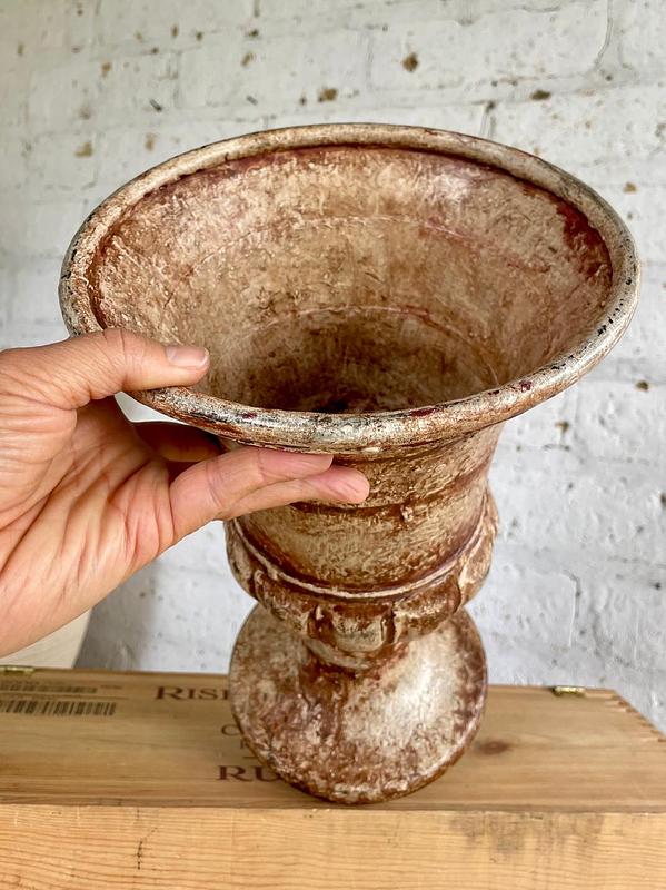 Copón elaborado en lámina metálica gruesa y pata pesada, decorado con pintura desgastada con apariencia de óxido envejecido.
