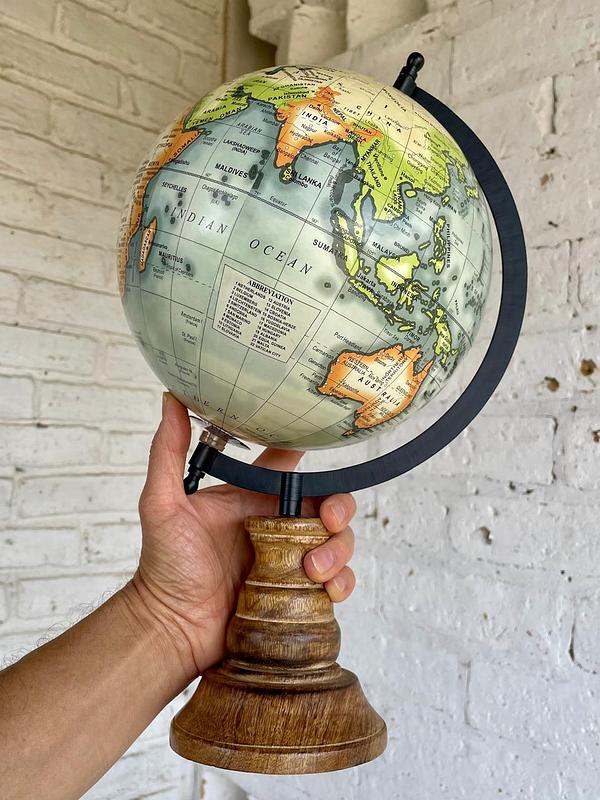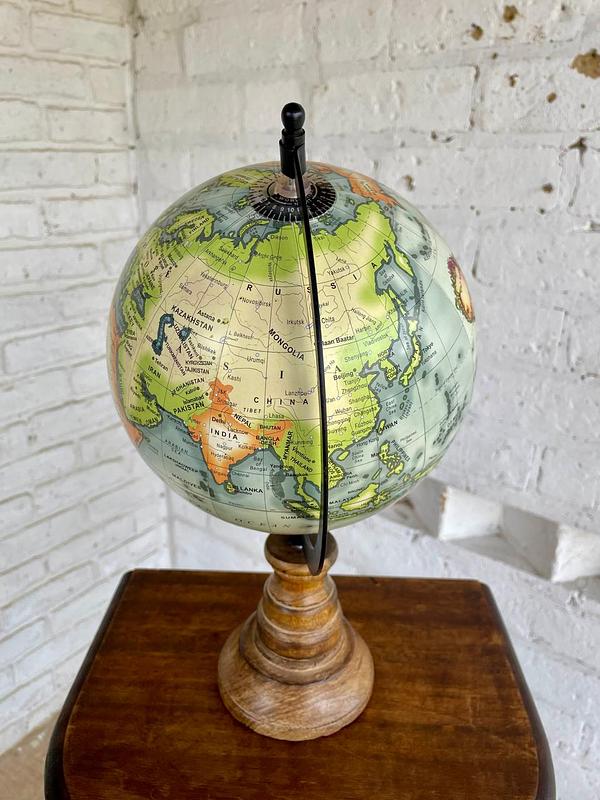 Globo terráqueo elaborado en India en 2008, la base es en madera, el eje metálico y el globo de resina y cartón. Se encuentra en buen estado.