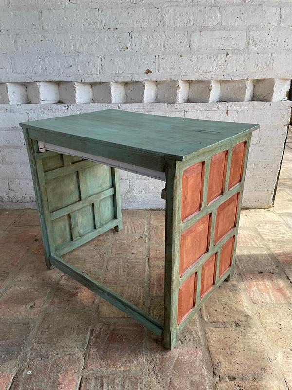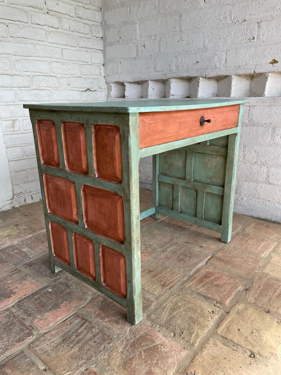 Mesa rústica en madera estilo escritorio de los años ochenta, recuperada y decorada con pintura desgastada manteniendo la apariencia envejecida, se encuentra en buen estado libre de gorgojos y termitas.