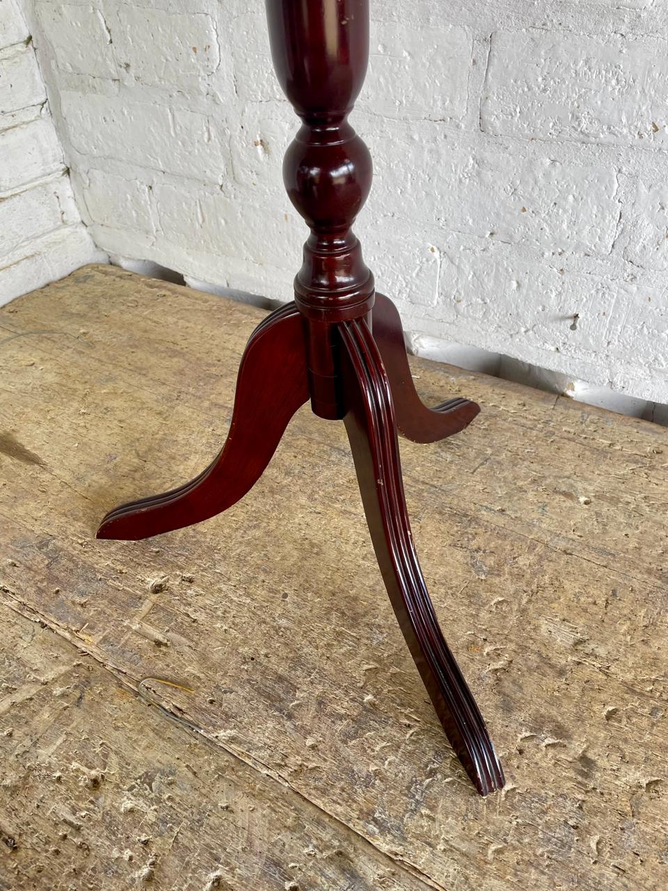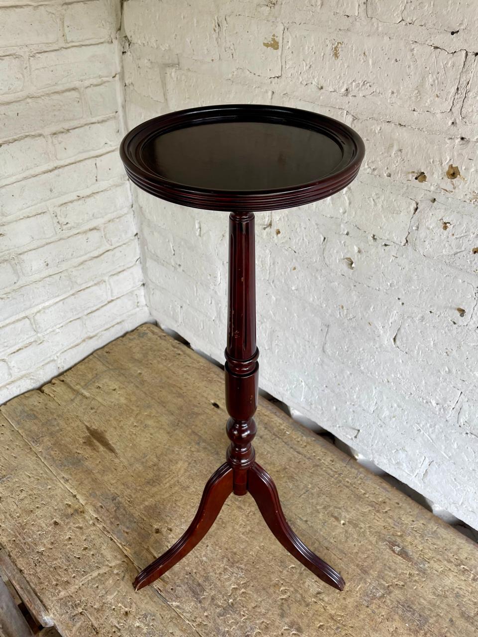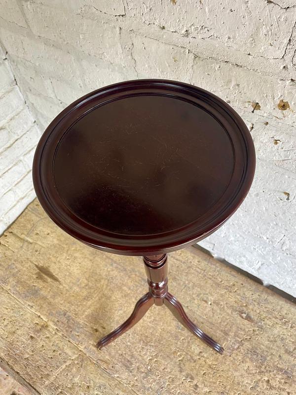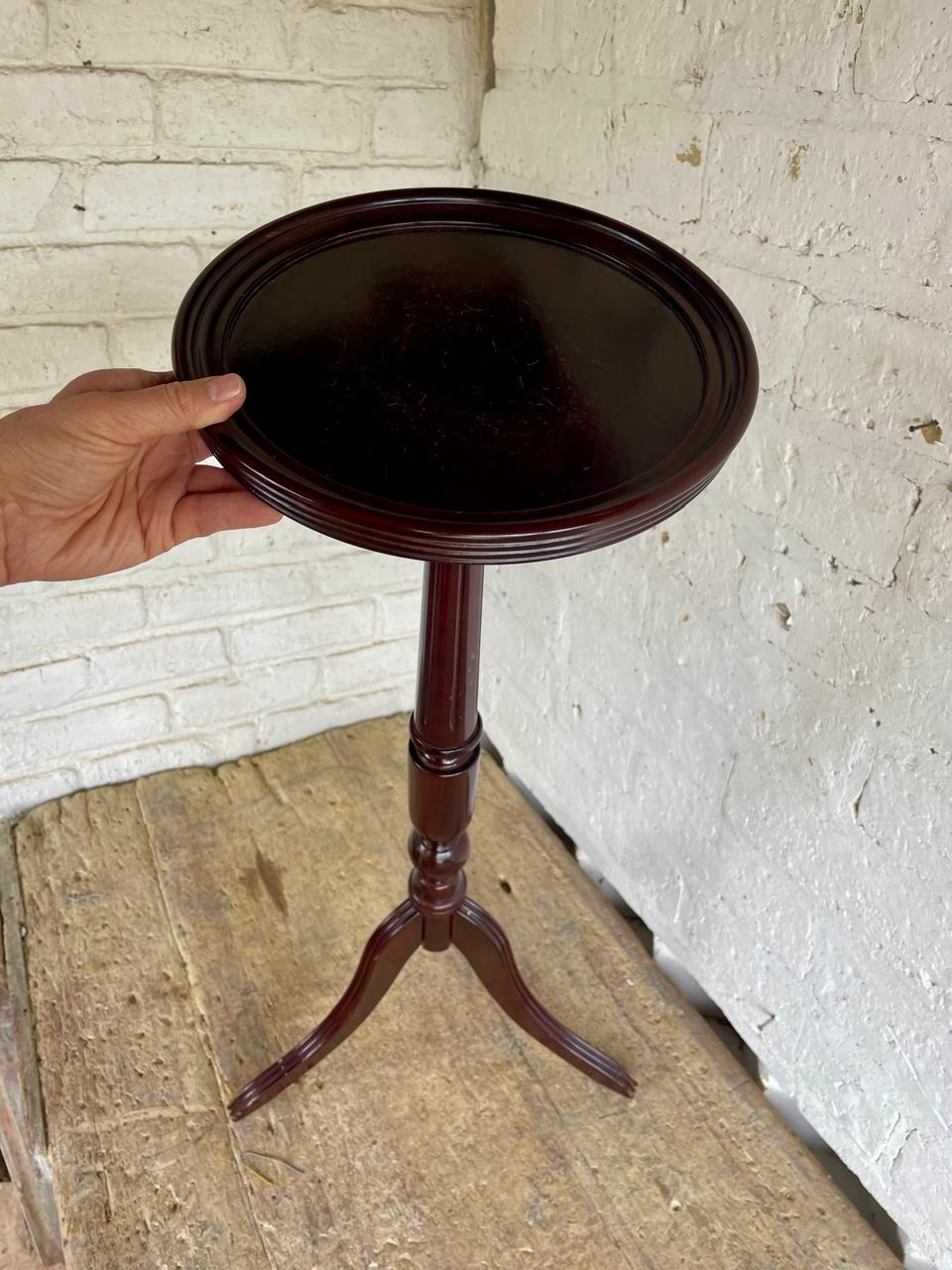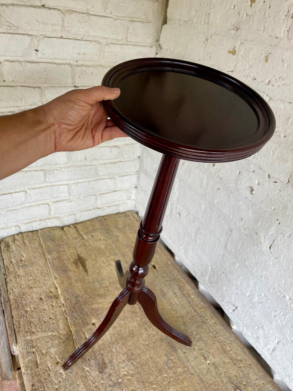 Mesa pedestal alta de madera, diseñada en USA y producida en China en 1993 para la marca de muebles The Bombay Company, INC. La mesa tiene un sistema de ensamble que permite separar las piezas para luego volverla a armar. Se encuentra en buen estado.