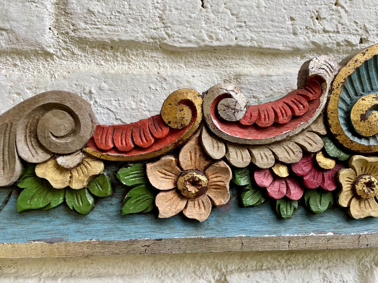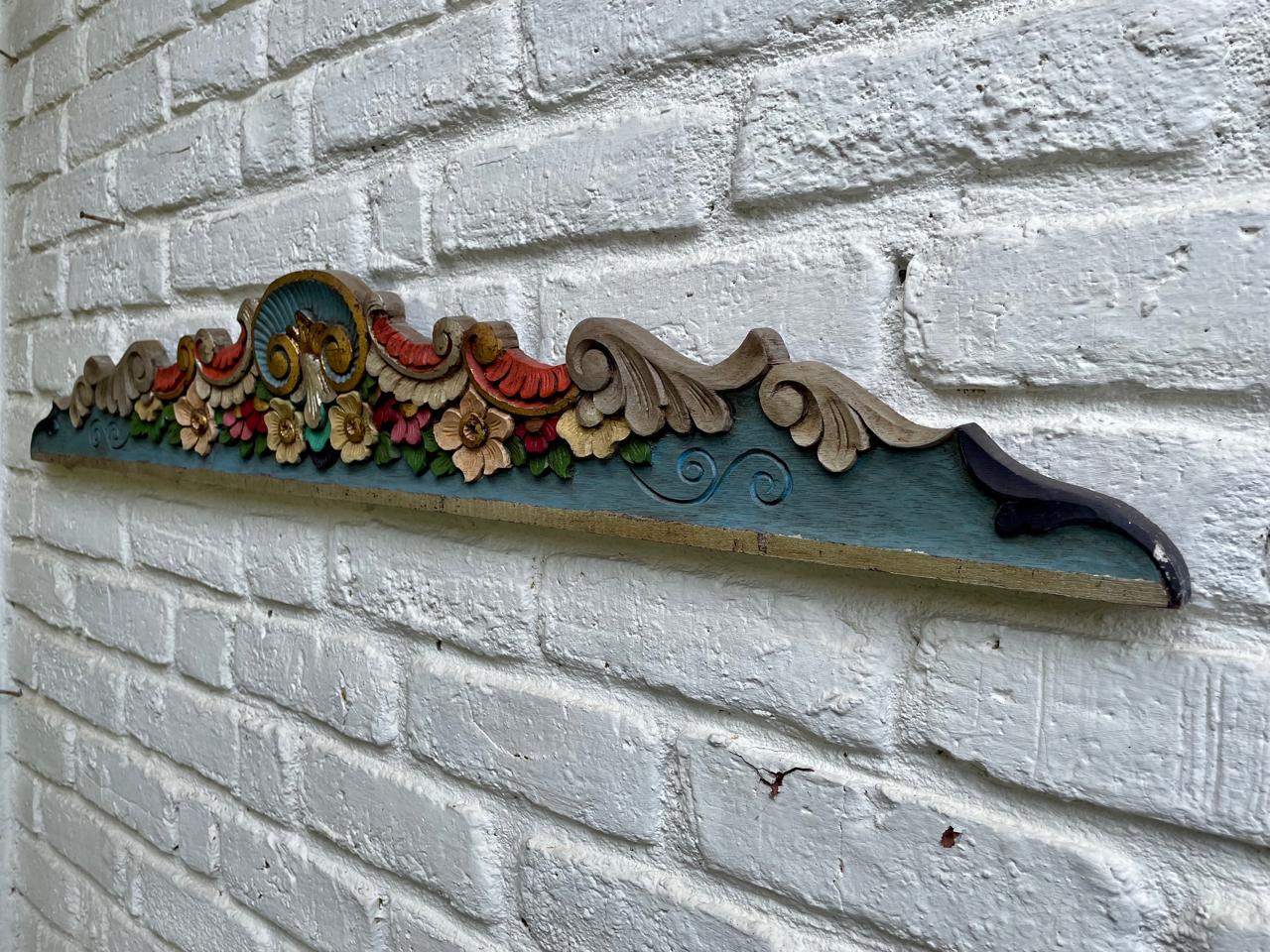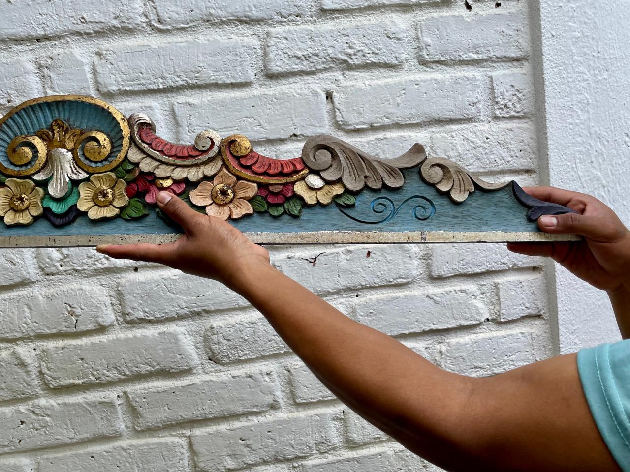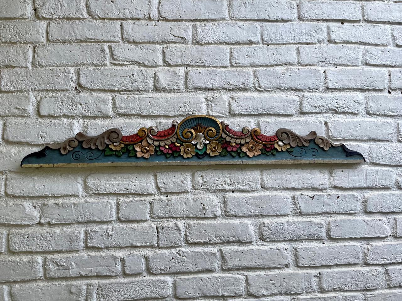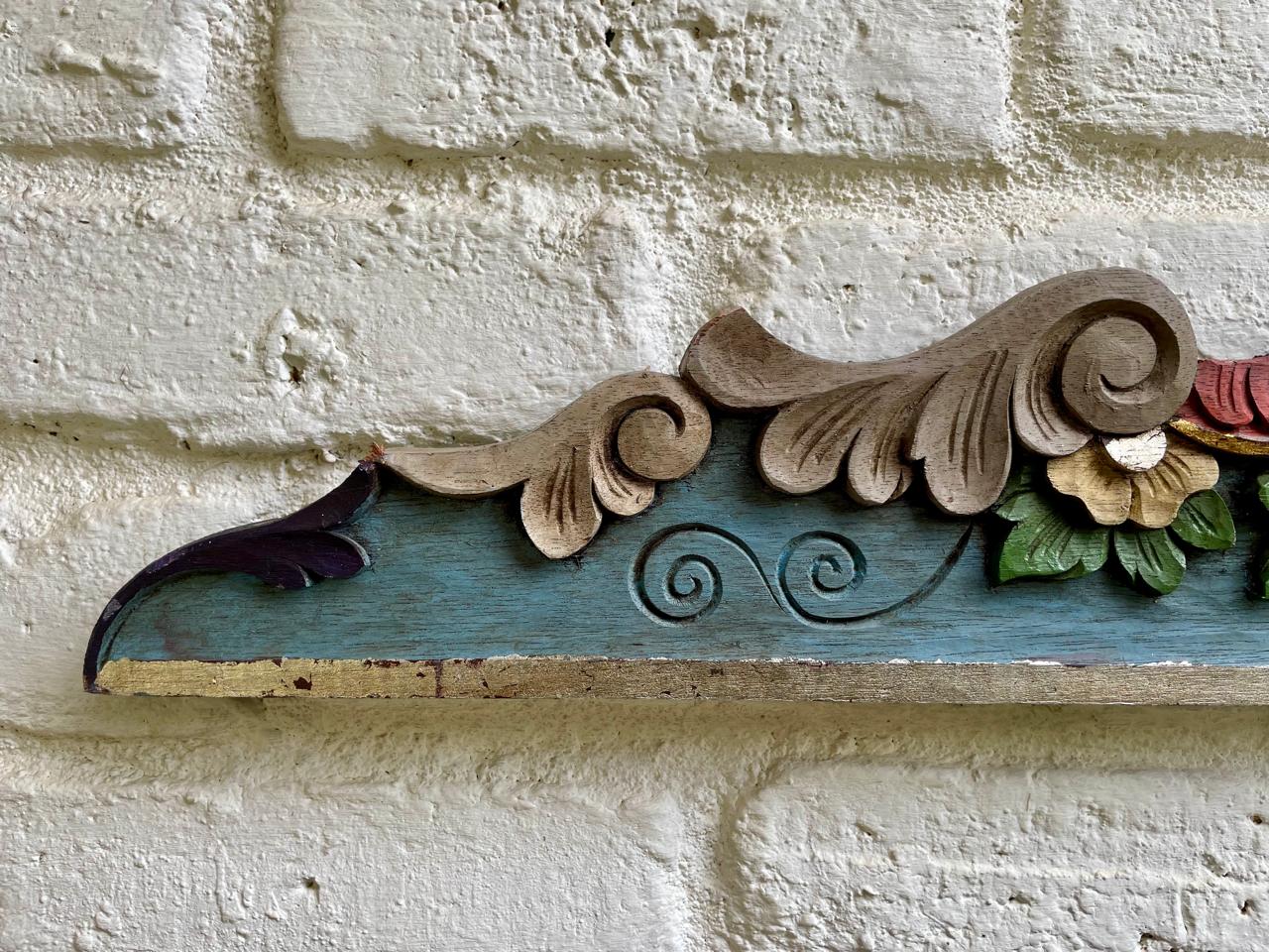 Friso o cenefa decorativa de madera tallada artesanalmente y pintada, comprado por sus anteriores dueños en Ibarra, Ecuador, en los años noventa. Tiene tallas en relieve con motivos florales y de volutas (desplazamientos curvos). La pieza está policromada predominan los tonos azul turquesa en la base, rojo en la parte superior curvada, y detalles en ocre, beige, rosa y verde para las flores y hojas, los rebordes en tonos dorados y plateados. Se encuentra en buen estado con algunos desgastes en la pintura por el paso del tiempo, la madera se encuentra libre de termitas.
