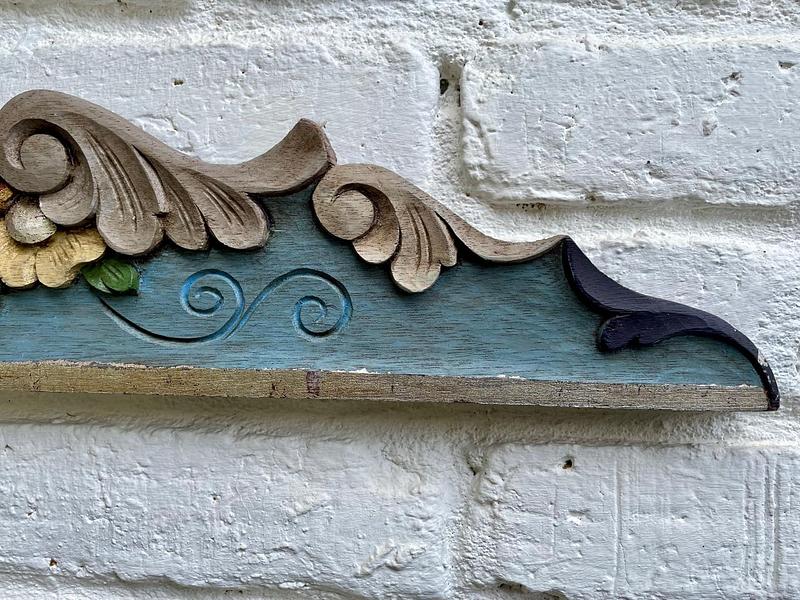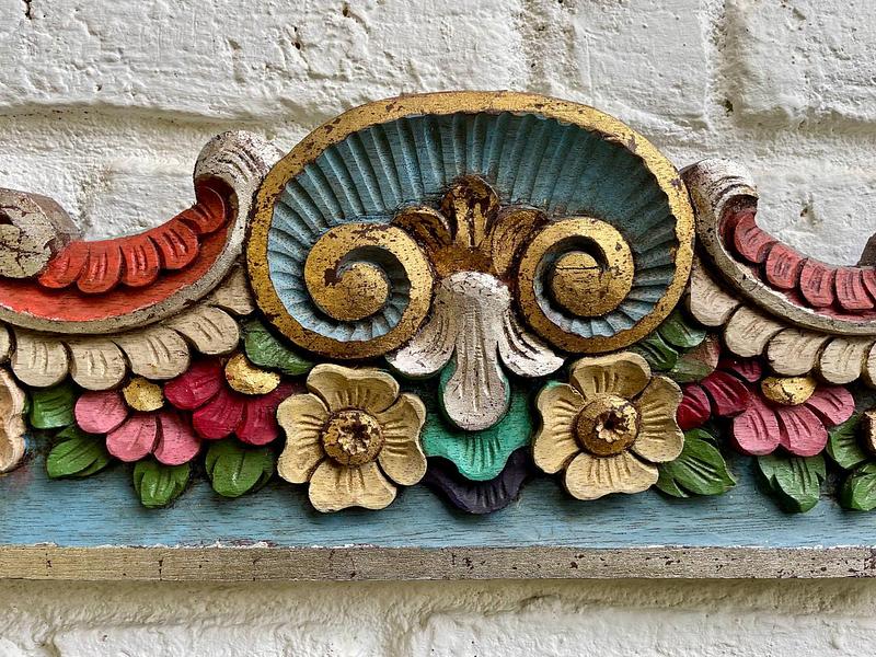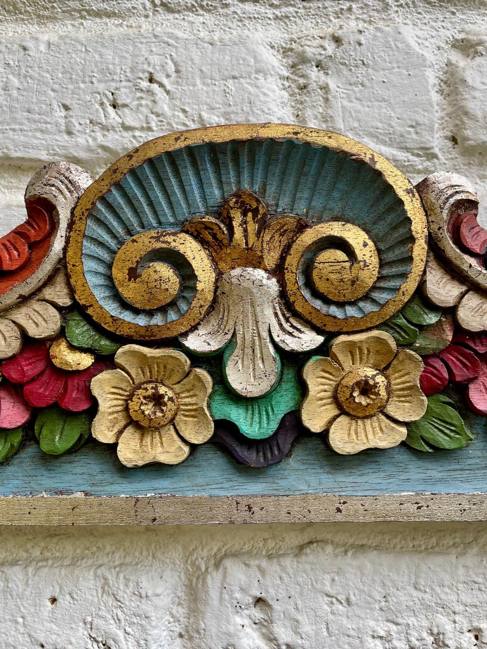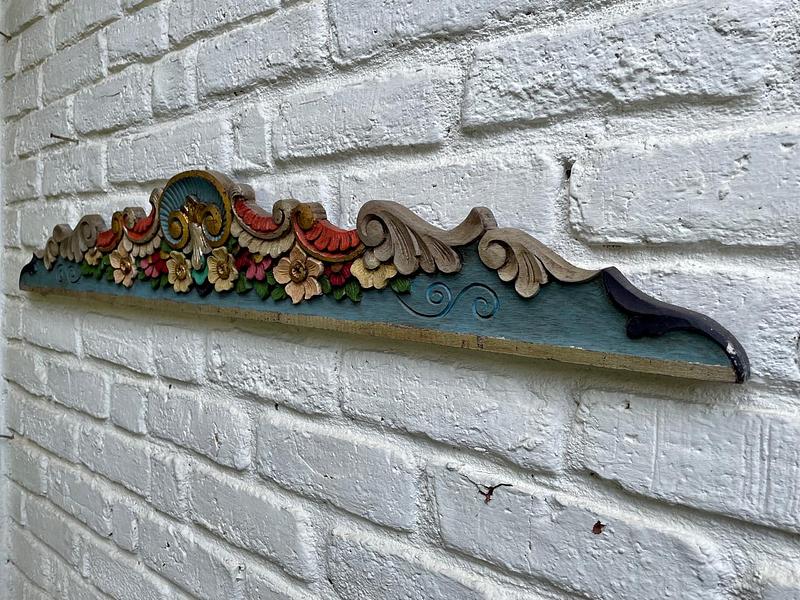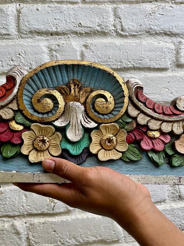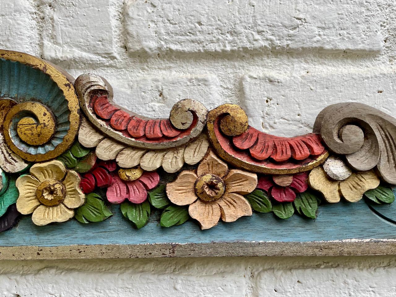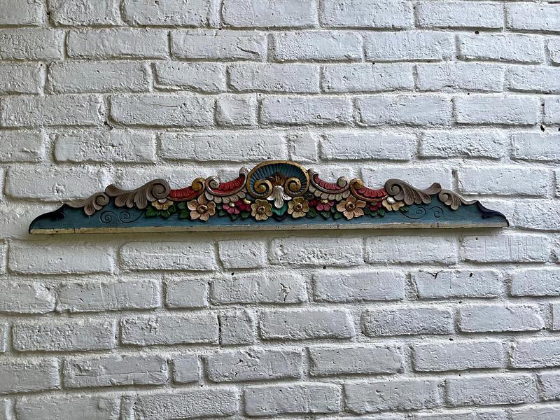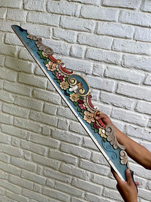 Friso o cenefa decorativa de madera tallada artesanalmente y pintada, comprado por sus anteriores dueños en Ibarra, Ecuador, en los años noventa. Tiene tallas en relieve con motivos florales y de volutas (desplazamientos curvos). La pieza está policromada predominan los tonos azul turquesa en la base, rojo en la parte superior curvada, y detalles en ocre, beige, rosa y verde para las flores y hojas, los rebordes en tonos dorados y plateados. Se encuentra en buen estado con algunos desgastes en la pintura por el paso del tiempo, la madera se encuentra libre de termitas.