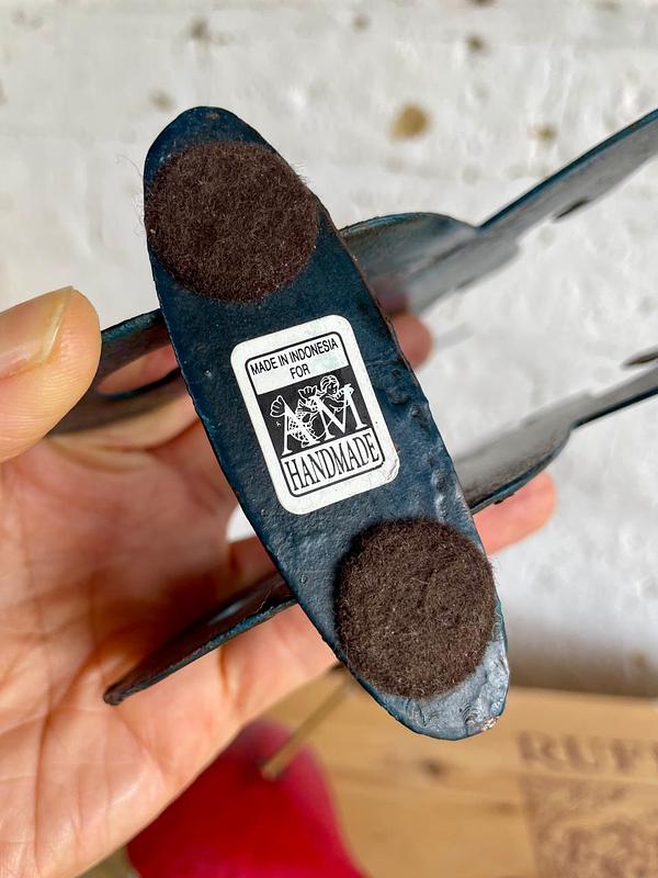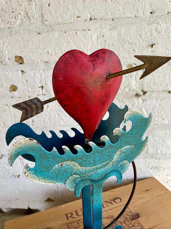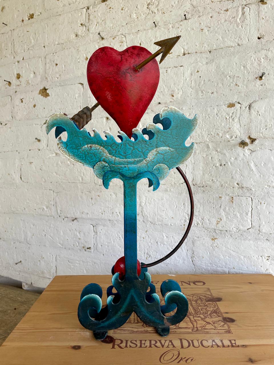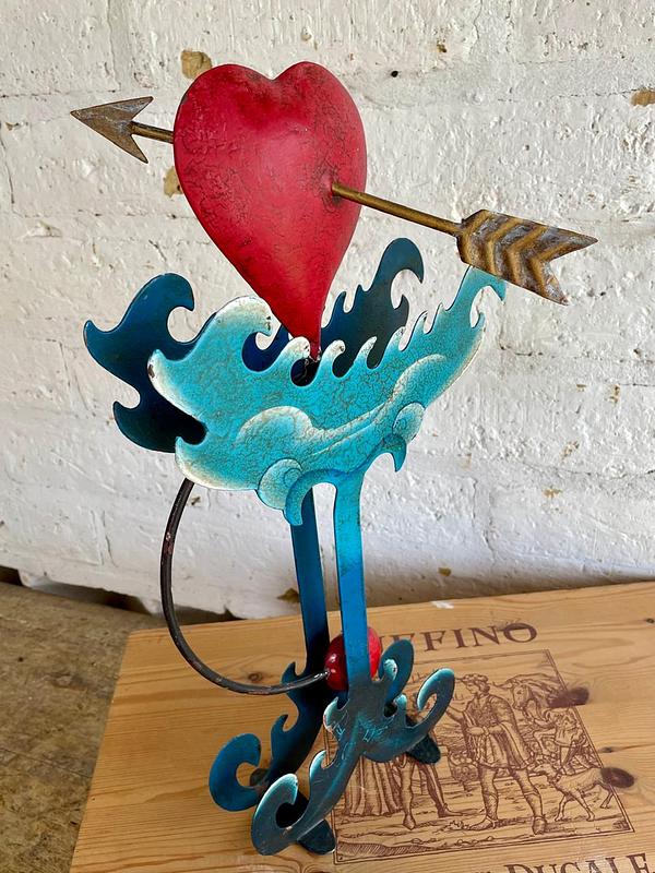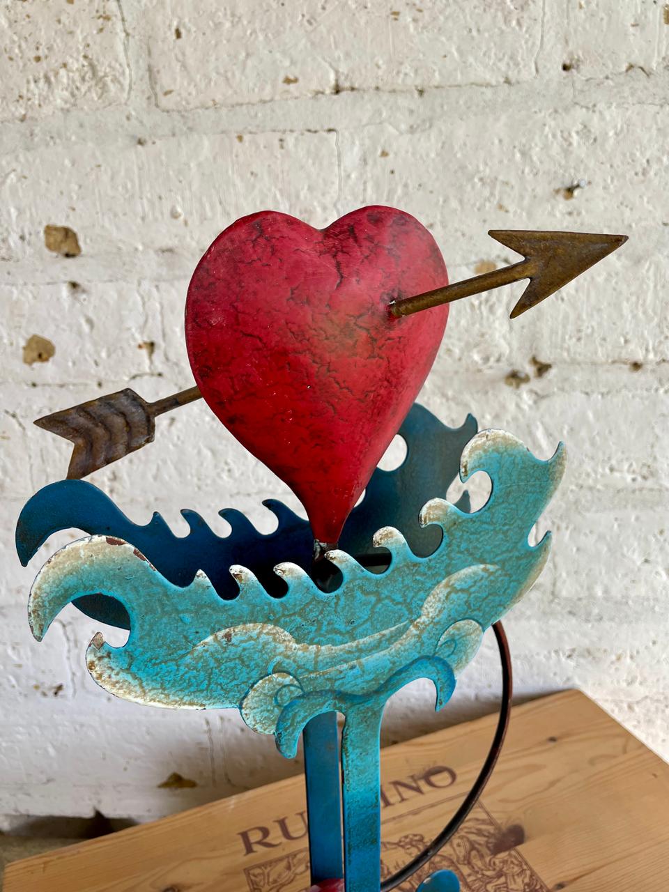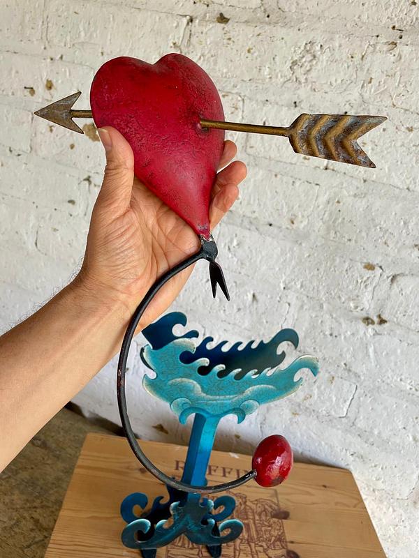 Figura balancín metálica de corazón, mantiene el equilibrio apoyado sobre una base y regulado por el péndulo. Elaborado artesanalmente en Indonesia en los años noventa y decorado con pintura desgastada. Reproduce un antiguo juguete. Se encuentra en buen estado con desgastes en la pintura producido por el uso y el paso del tiempo.
