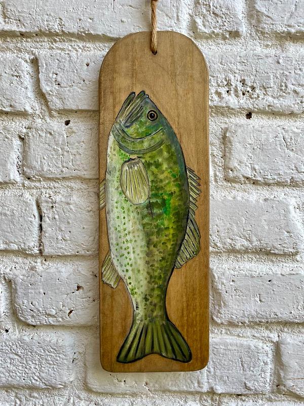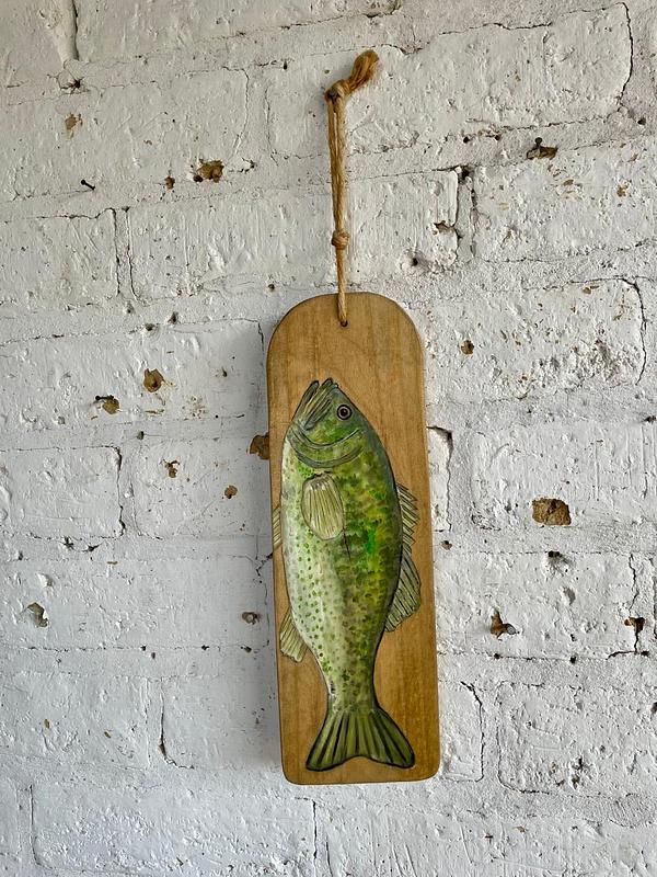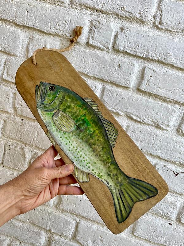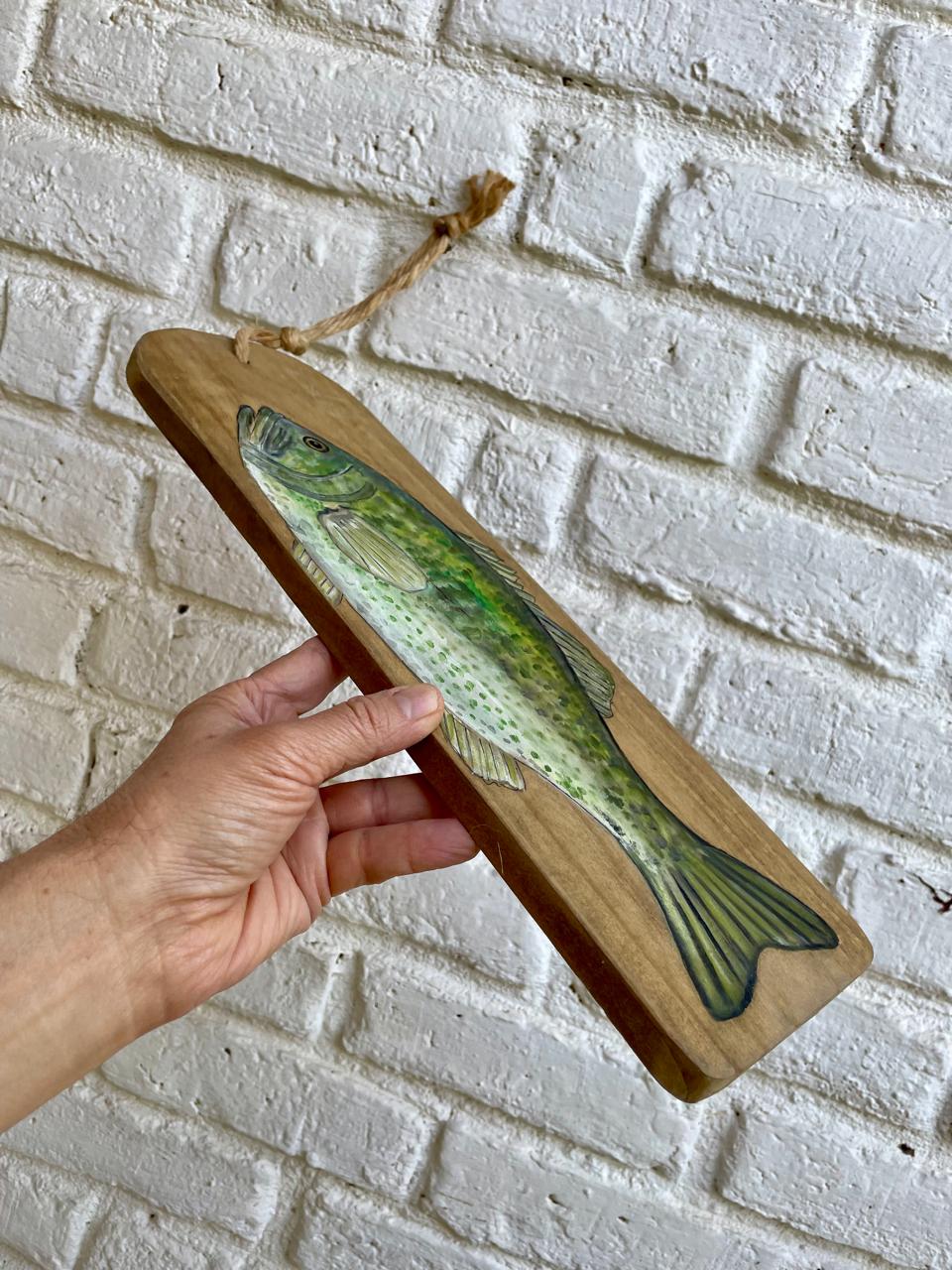 Pintura original al óleo y plumilla sobre madera de un pez Lubina de Florida elaborado por un artista local de Fort Myers FL, USA, en 1995.