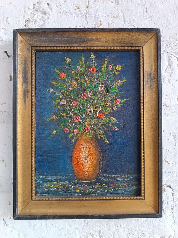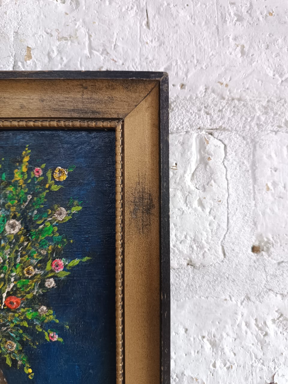 Pintura original al oleo sobre madera enmarcarda en moldura de resina. El marco presenta desgastes en la pintura.