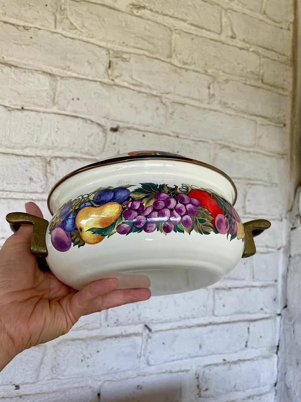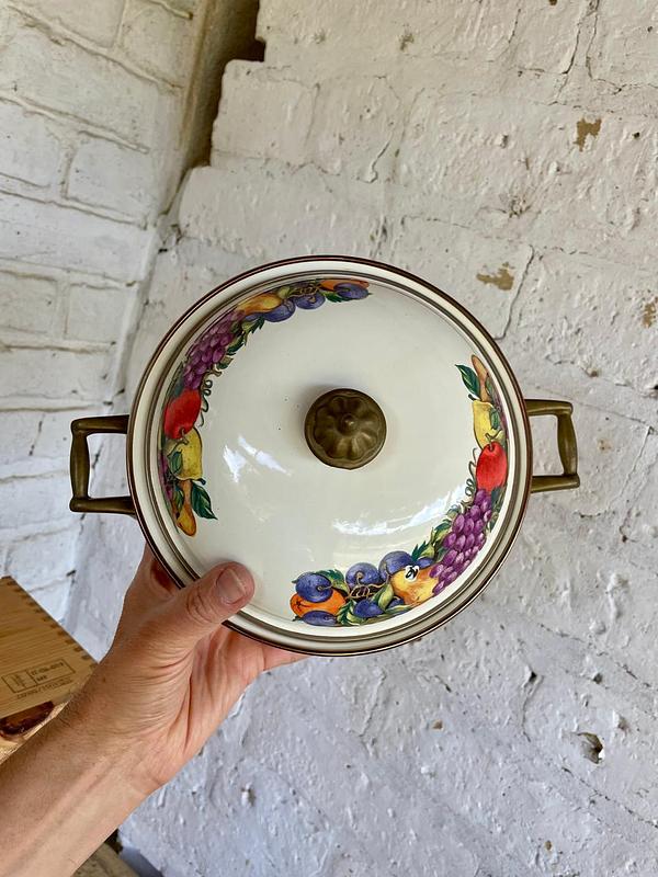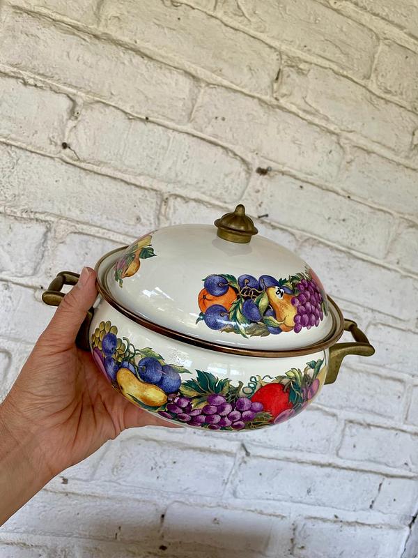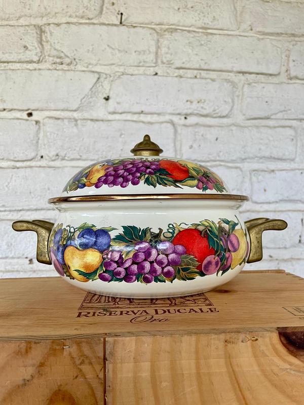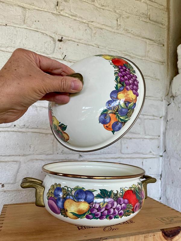 Olla elaborada en lámina metálica gruesa recubierta con esmalte extrafuerte horneado, las manijas, la perilla de la tapa y los rebordes son en bronce. El esmalte está decorado con figuras coloridas de frutas. Producida en los años setenta en Taiwan para la marca holandesa de utensilios esmaltados Cornucopia. Presenta pequeños desgastes en el esmalte por el uso.