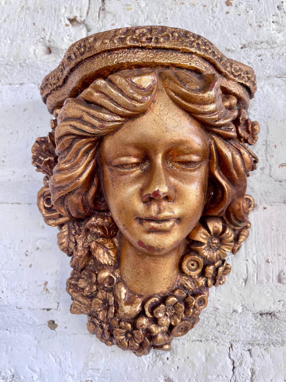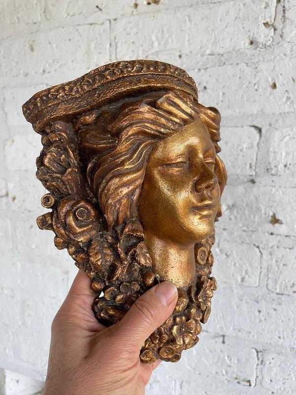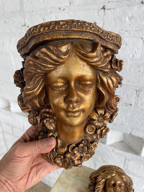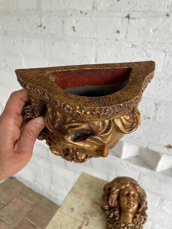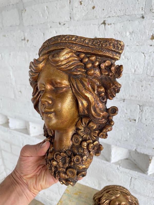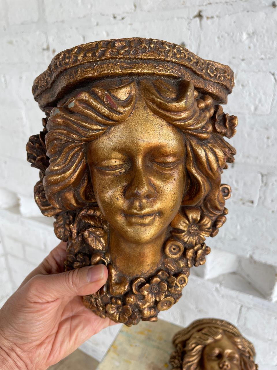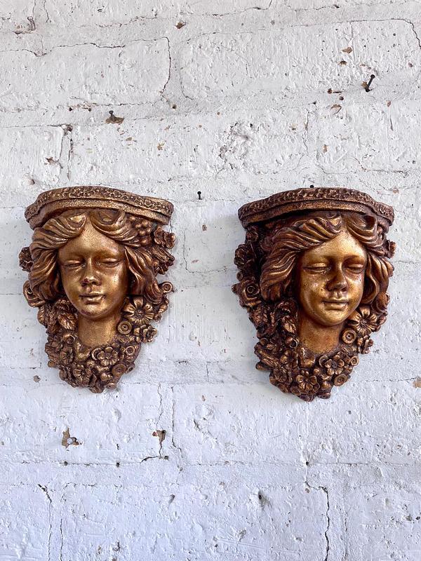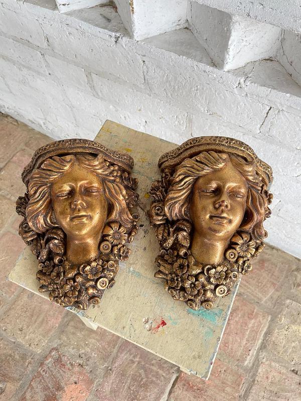Pareja de apliques de pared elaborados en Italia en los años sesenta en resina de alta resistencia con apariencia de madera tallada y decorados en dorado. Se encuentran en buen estado.