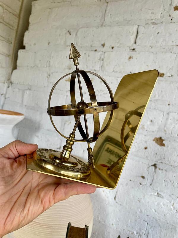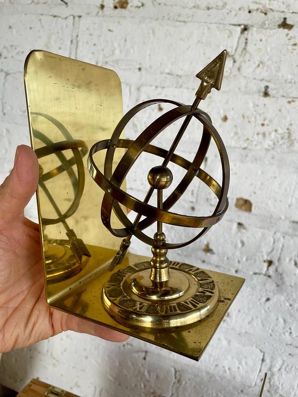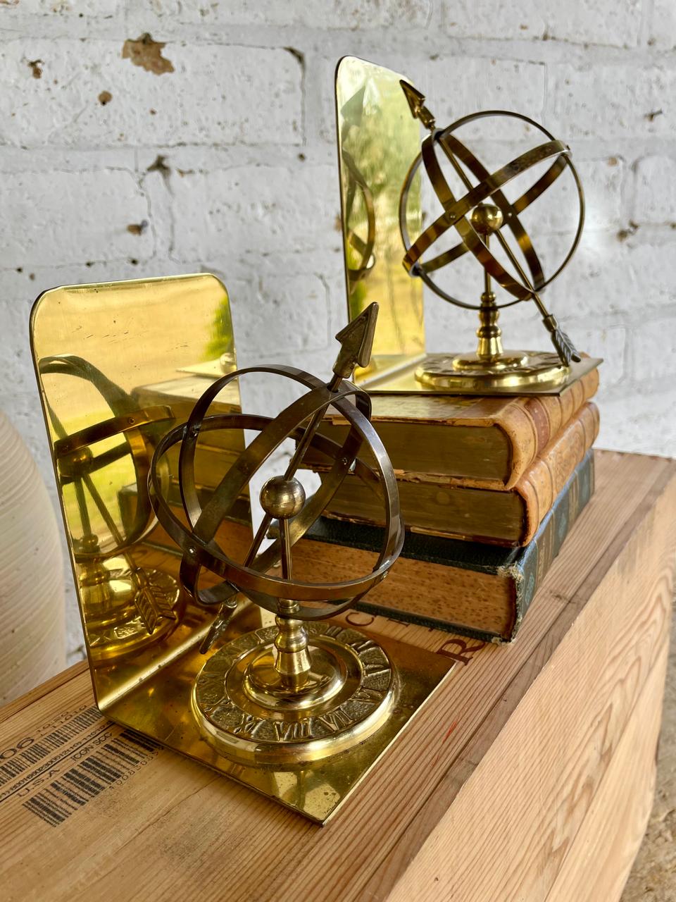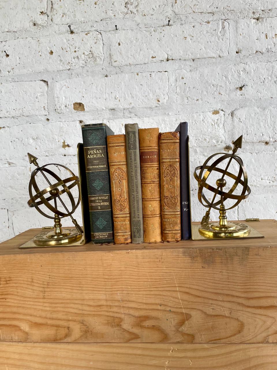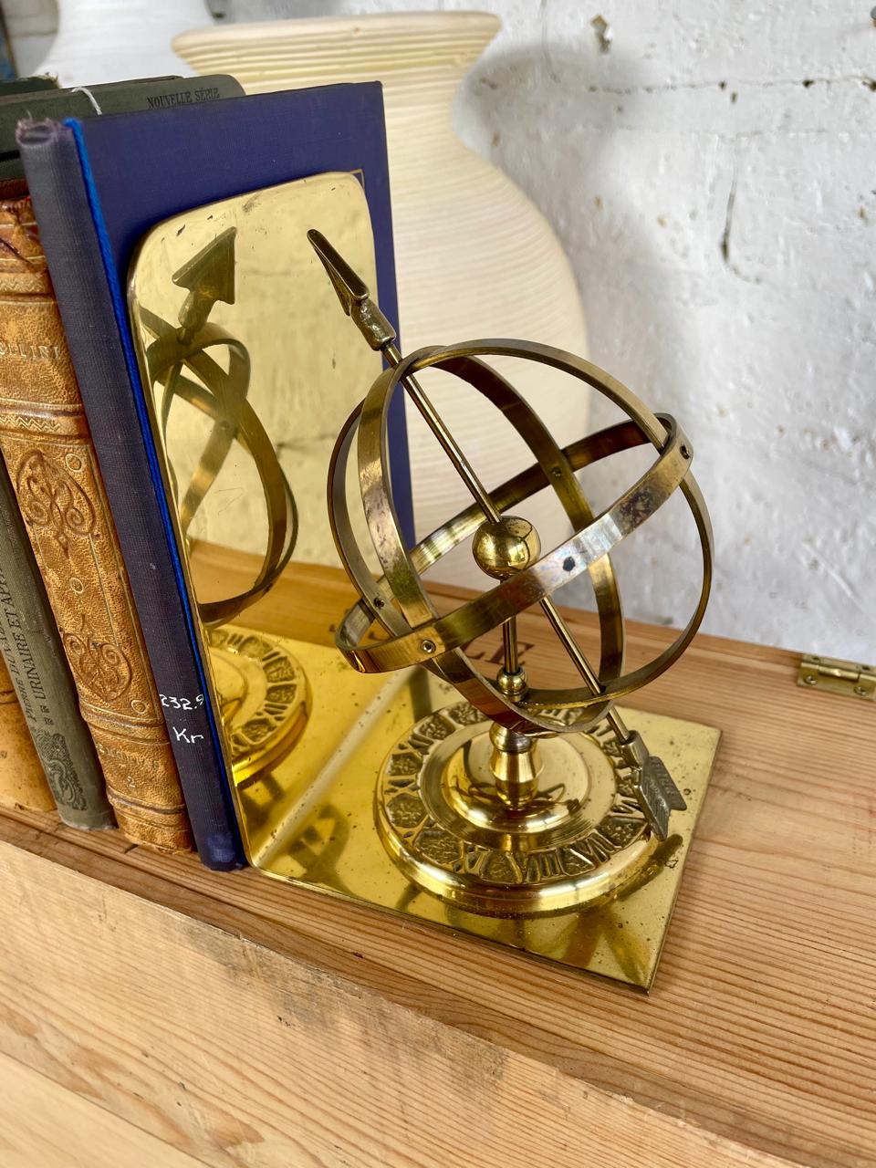 Pareja de tranca libros en bronce, decorados con la figura de una esfera armilar elaborados en Tawian en los años setenta. Se encuentran en buen estado.
