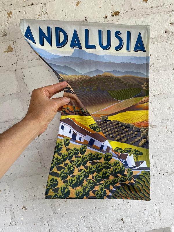 Pendón impreso sobre tela de un antiguo afiche promocional de Andalucía. Tiene soportes metálicos en la parte de arriba y de abajo. Se encuentra en buen estado.