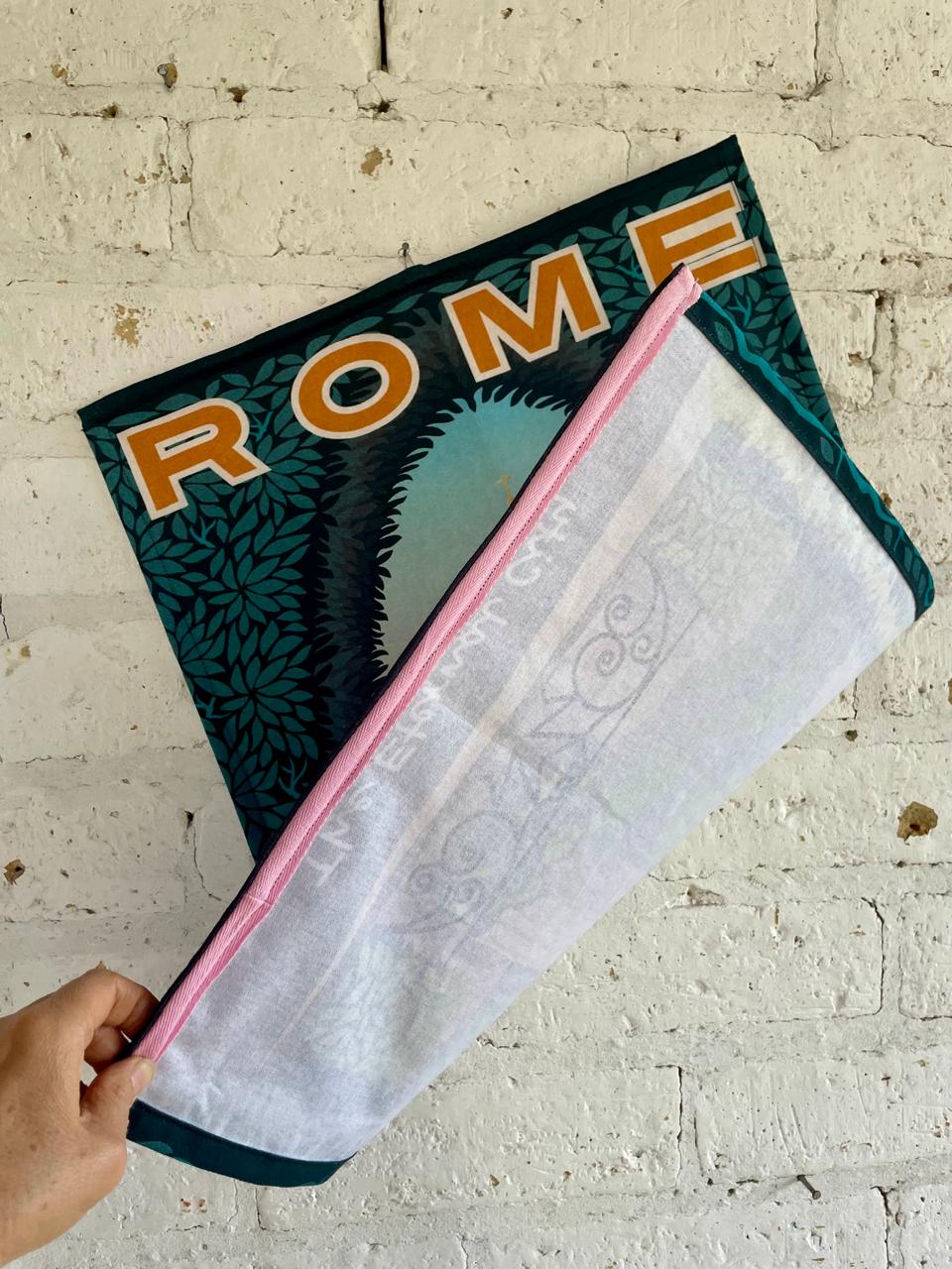 Pendón impreso sobre tela de un antiguo afiche promocional de Roma. Tiene soportes metálicos en la parte de arriba y de abajo. Se encuentra en buen estado.