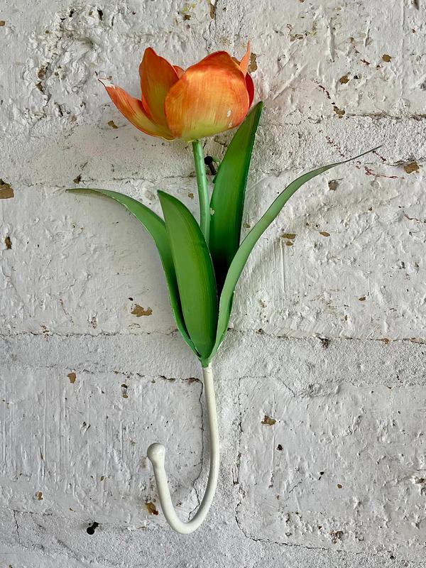 Percha de pared decorativa con forma de flor en lámina metálica pintada a mano en tonos pastel.