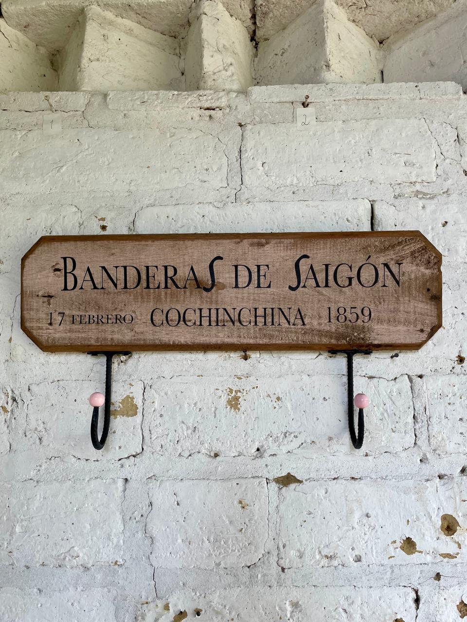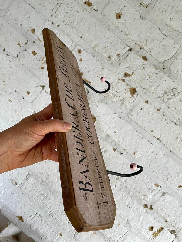 Perchero elaborado en tabla de madera reciclada decorada con pintura desgastada con apariencia envejecida. Los ganchos son metálicos con bolas de madera en la punta.