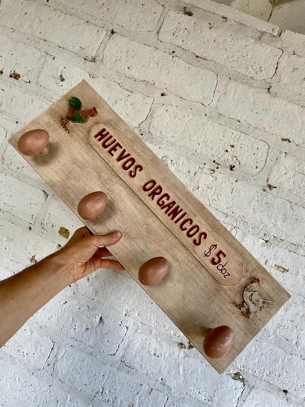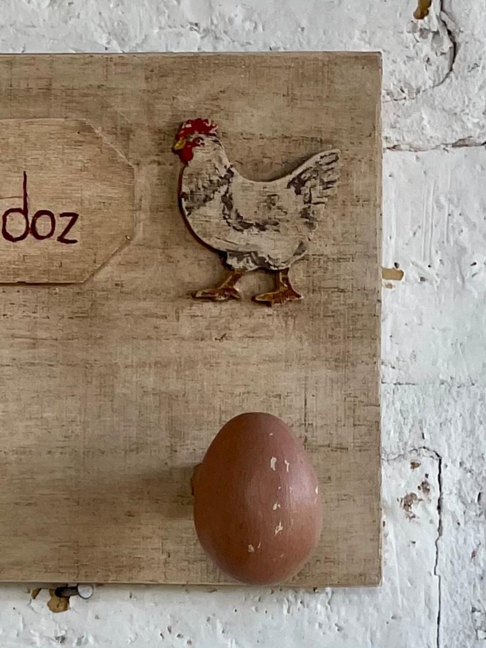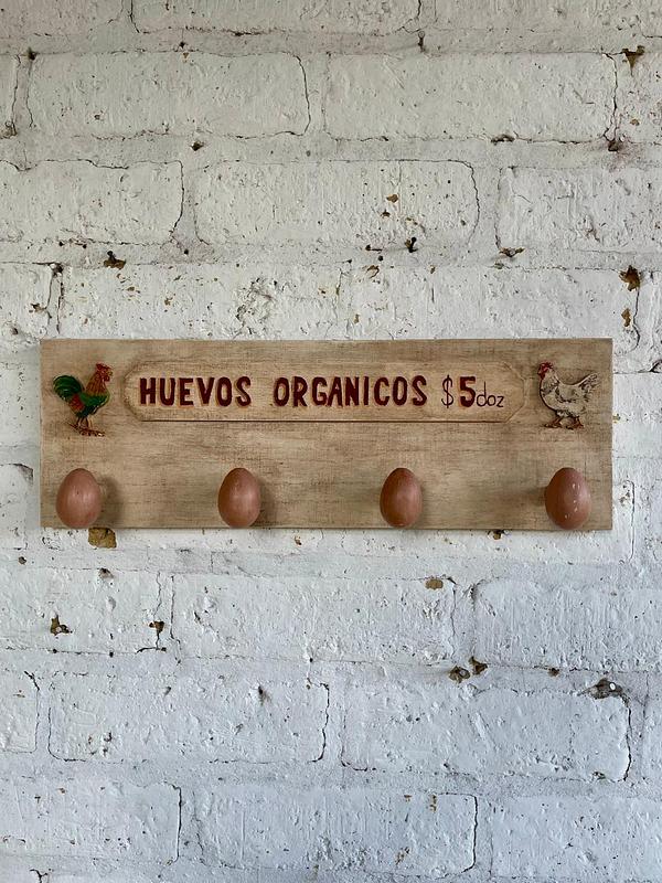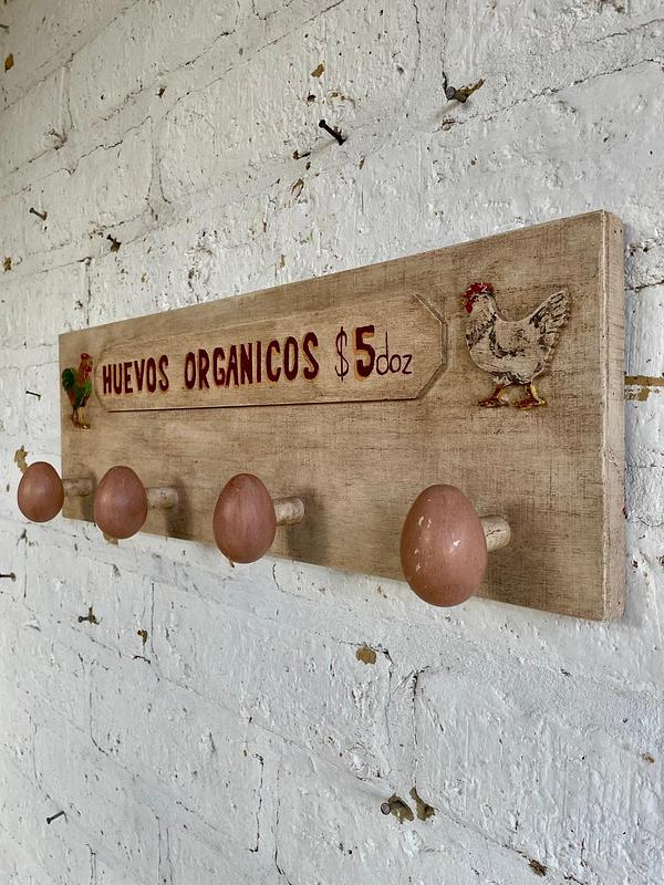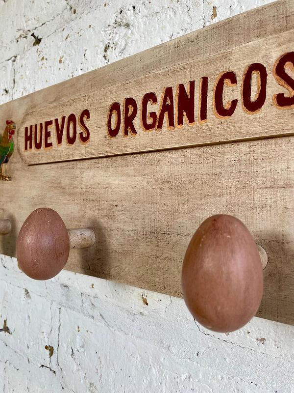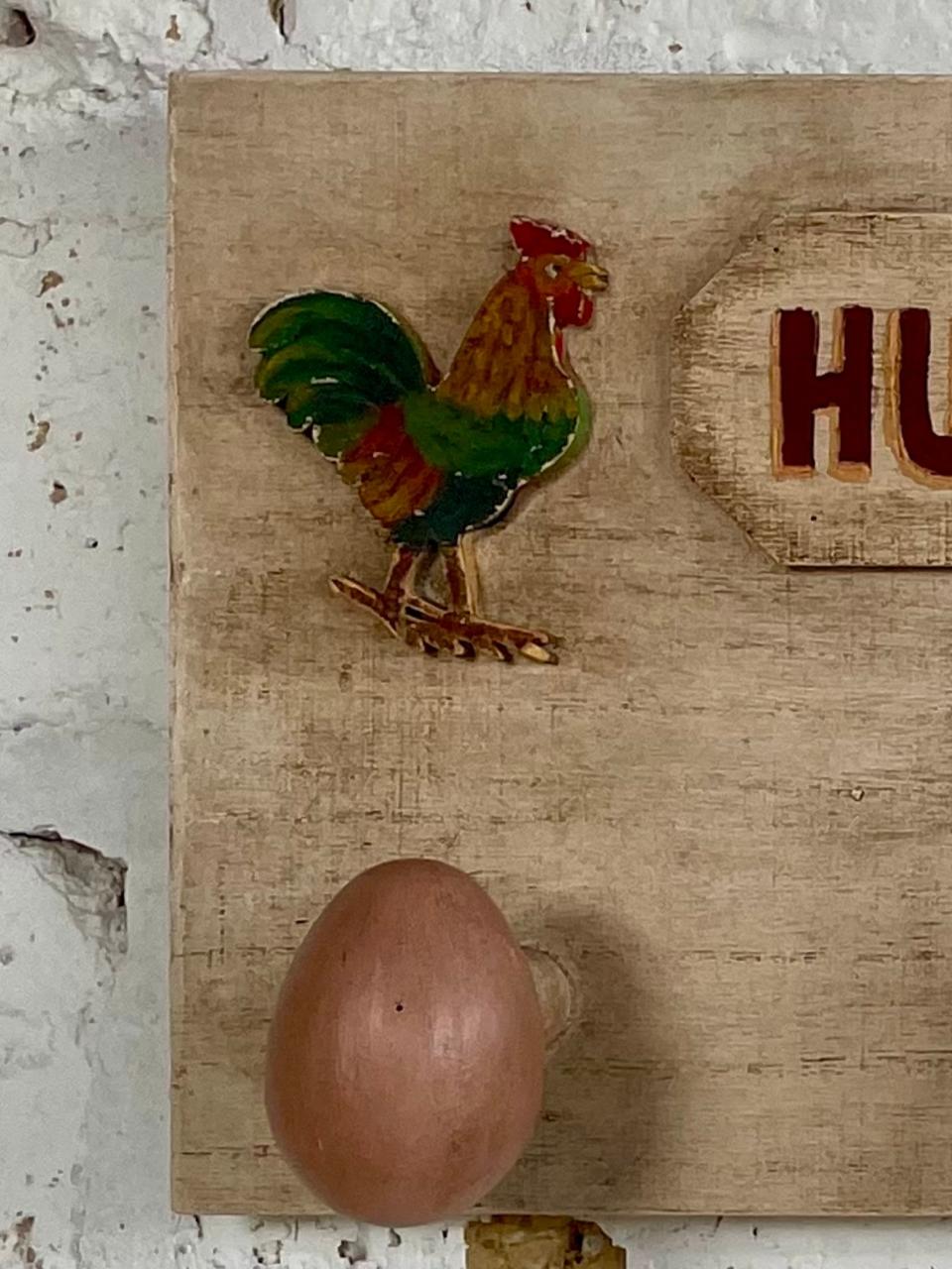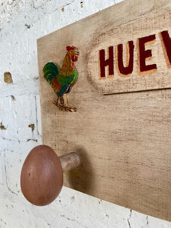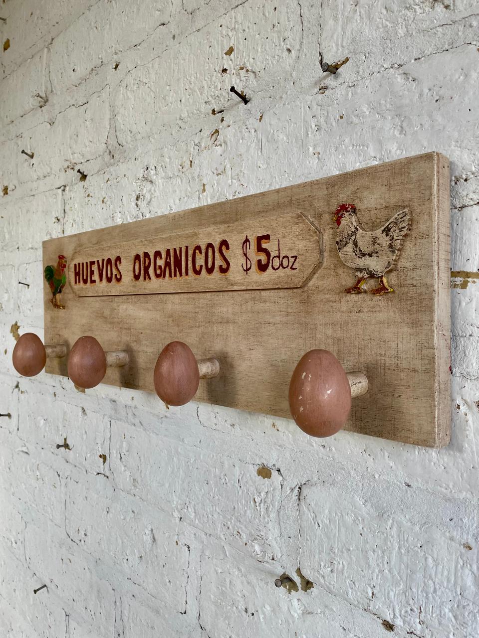 Perchero de madera con 4 ganchos decorados con huevos tallados en madera y la figura pintada de una gallina y un gallo.