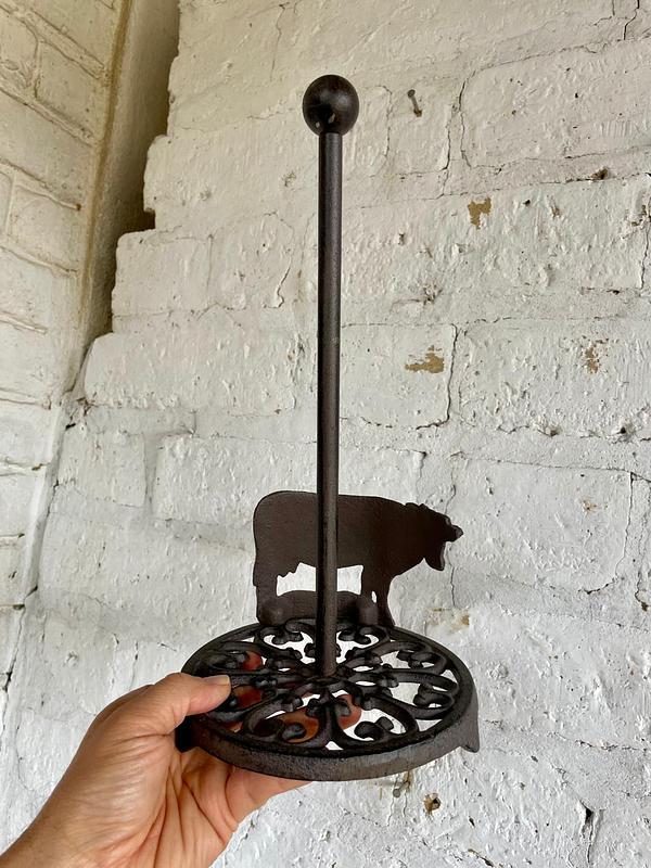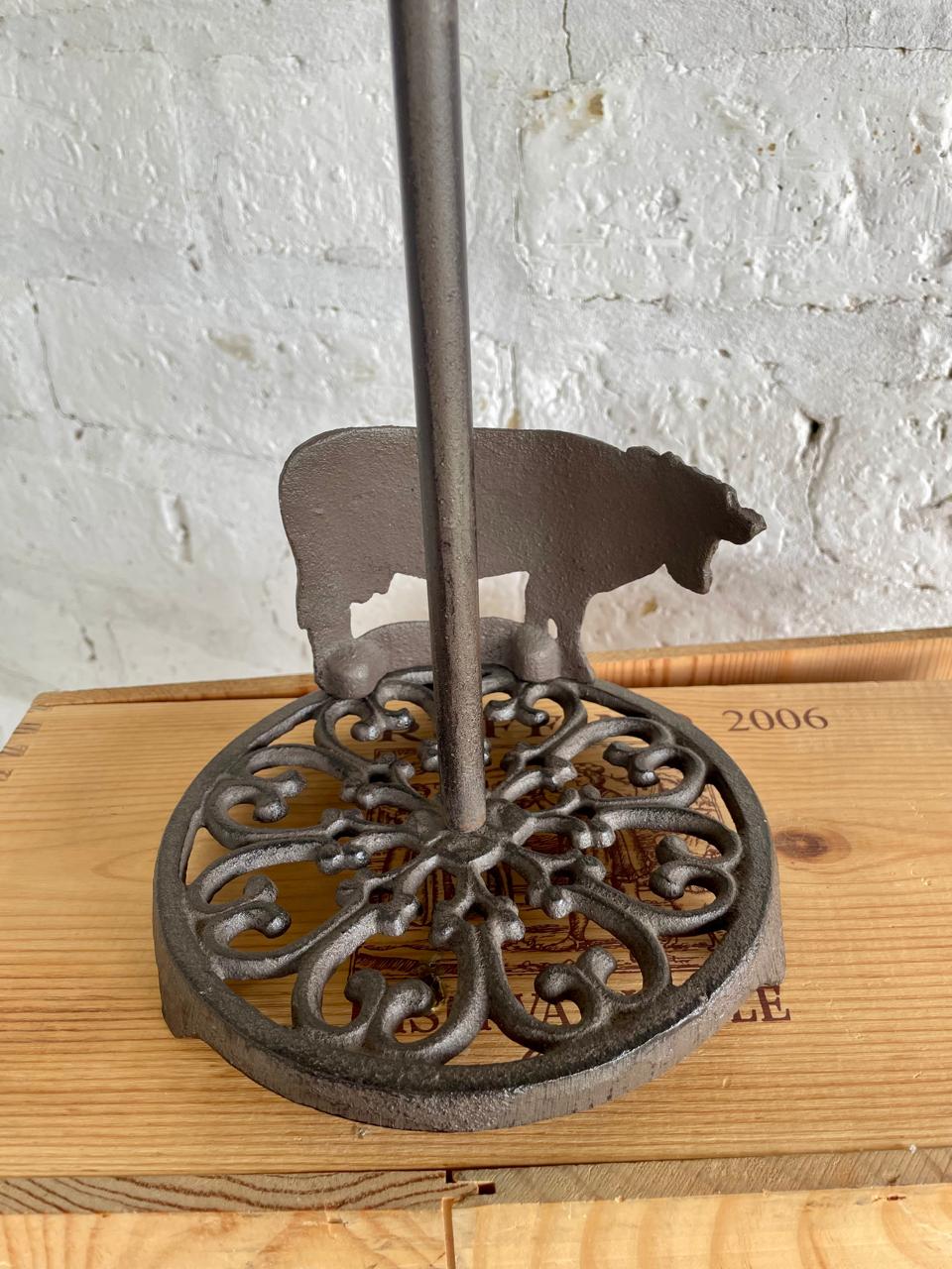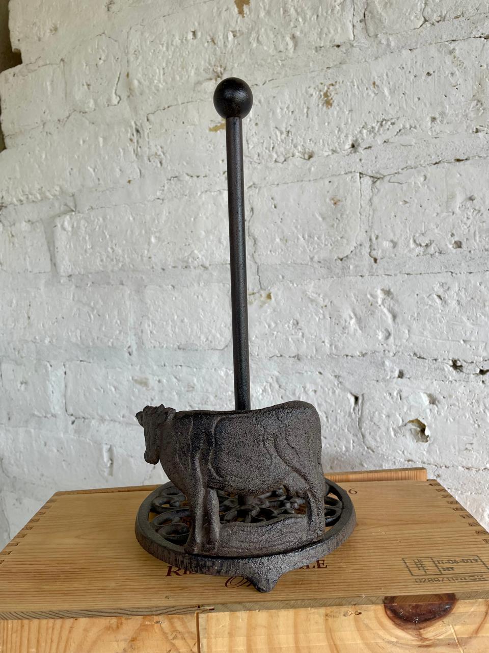 Dispensador de rollo de toallas en papel para cocina, elaborado en hierro fundido y decorada con una vaca en la base.