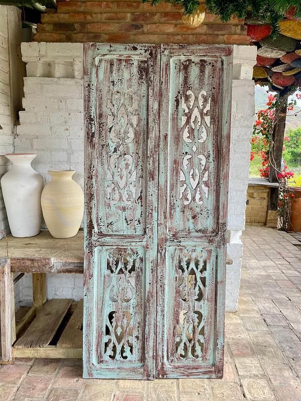 Puerta recuperada de una casa antigua de inicios del S. XX, conserva la pintura original desgastada por el paso del tiempo. La puerta se encuentra en buen estado, libre de termitas y gorgojos, presenta algunas desastilladuras, desgaste e imperfecciones generados a través de más de un siglo de existencia.