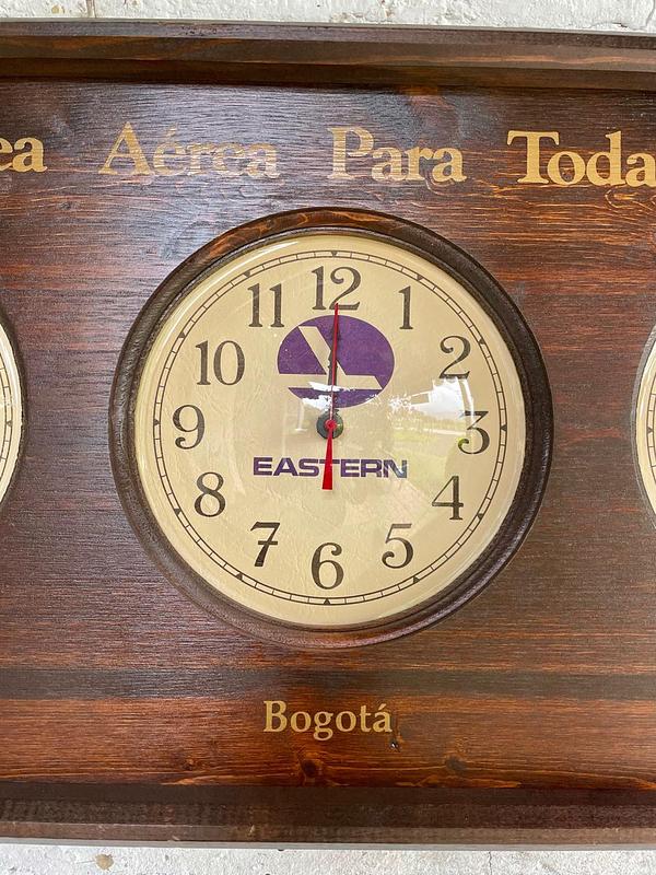 Reloj utilizado en diferentes aeropuertos de América para mostrar tres zonas horarias simultáneamente. Ensamblado en Estados Unidos en los años ochenta: la caja es en madera, los mecanismos de los relojes de pila AA son japoneses y los protectores cóncavos de acetato grueso. Pieza de colección con la publicidad "Una Línea Aérea Para Toda América", de la aerolinea Estern Air Line liquidada en 1991. Cuenta con tres esferas individuales que permiten seguir la hora en diferentes ciudades clave para la red de la aerolínea en ese momento: Los Ángeles, San Francisco y Seattle. Bogotá. Miami, Nueva York y Washington D.C. La madera de la caja se encuentra en buen estado y los mecanismos de cuarzo de los relojes funcionan bien.