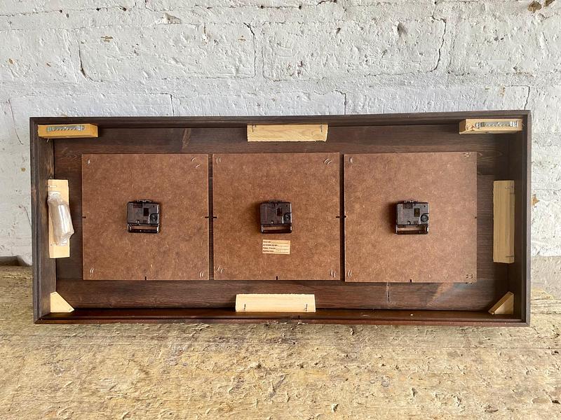 MEDIDAS: Caja de madera 84 x 35,5 x 9 cm. Diametro de cada reloj 18 cm.