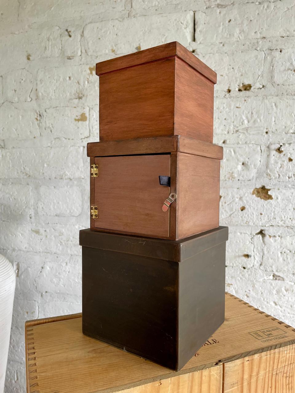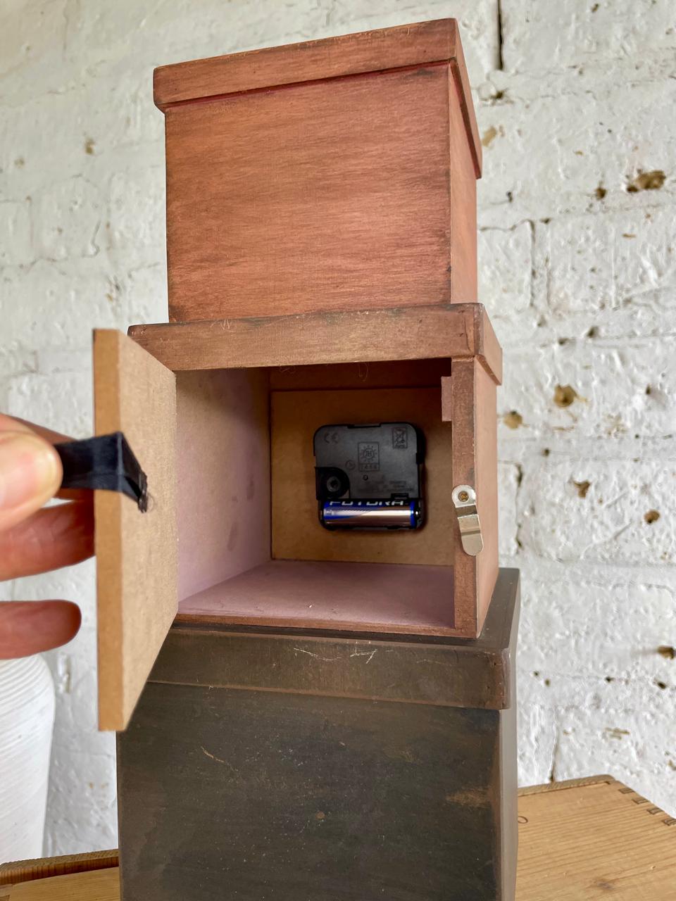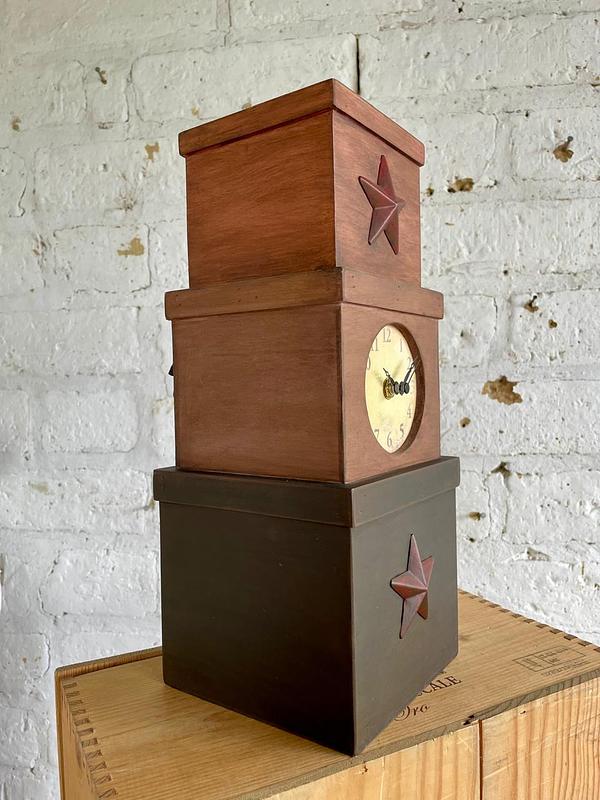 Reloj de mesa de diseño rústico de cajas en madera que evoca una estética de "country primitivo". Compuesto por tres cajas de diferentes tamaños apiladas en forma de torre decoradas con 2 estrellas metálicas, un símbolo común en la decoración de estilo American Vintage. En la caja central se encuentra el tablero y el mecanismo que funciona con una pila AA