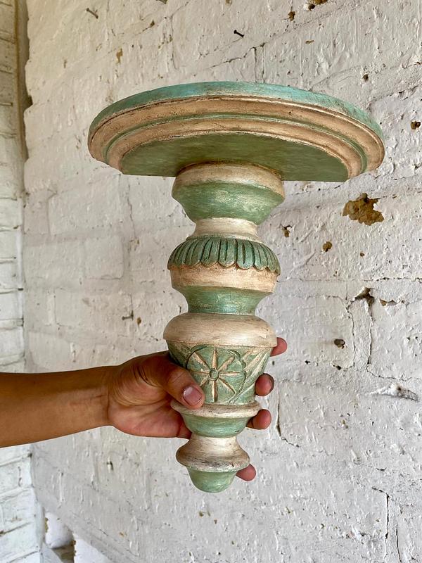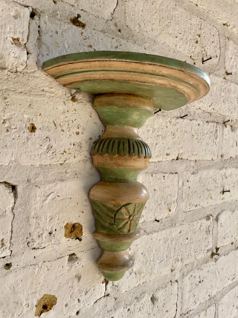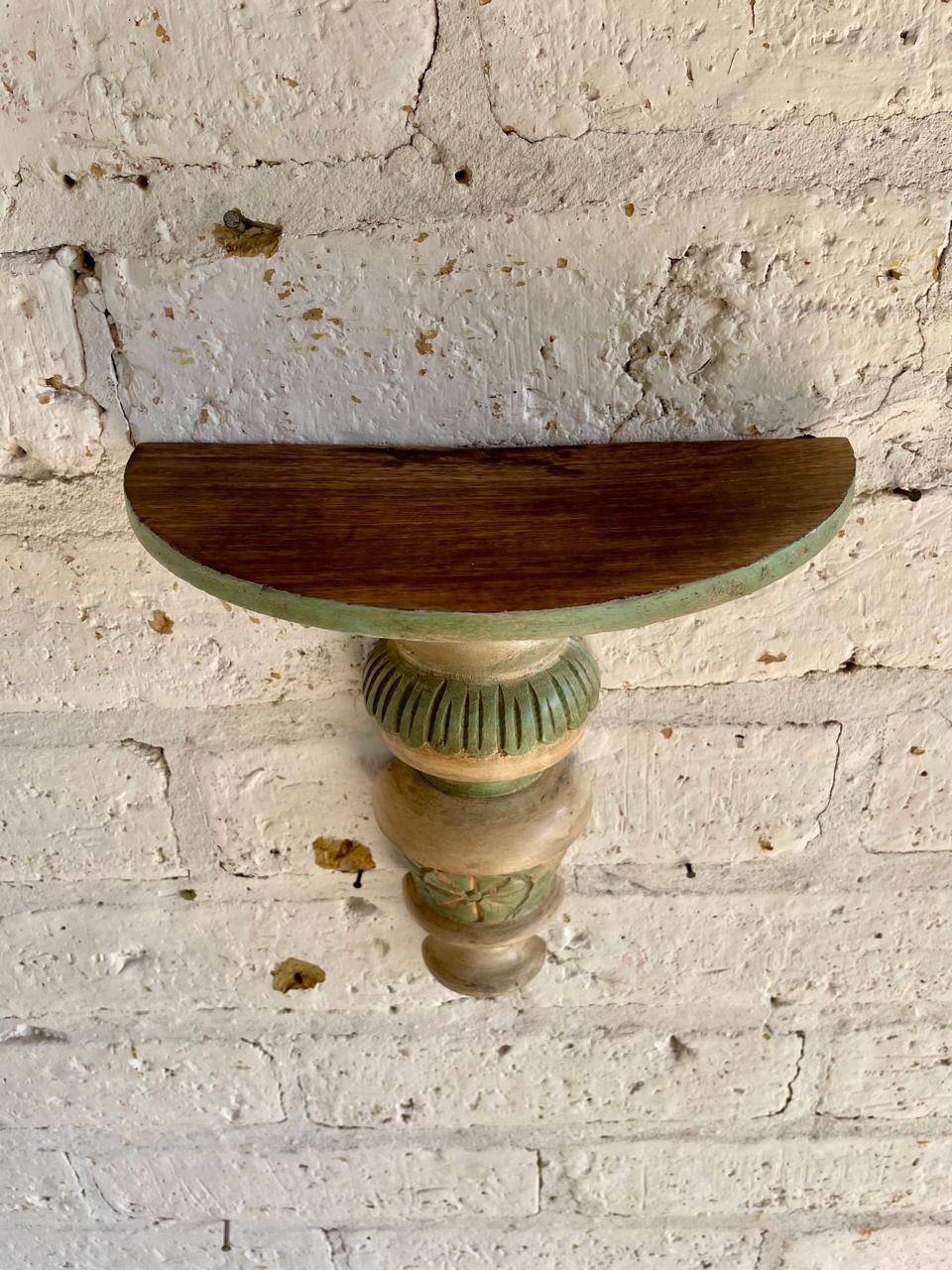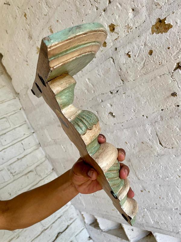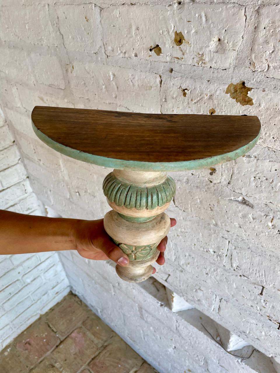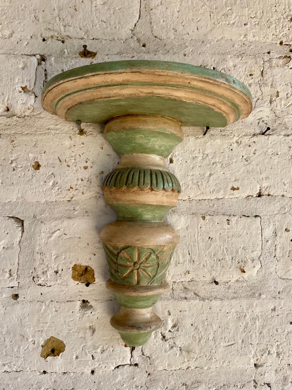 Repisa en madera tallada decorada con pintura verde y blanca desgastada, elaborada por artesanos en la India en los años ochenta, se encuentra en buen estado, libre de termitas y gorgojos.