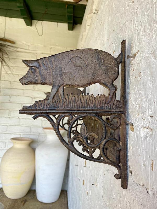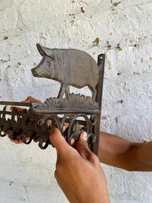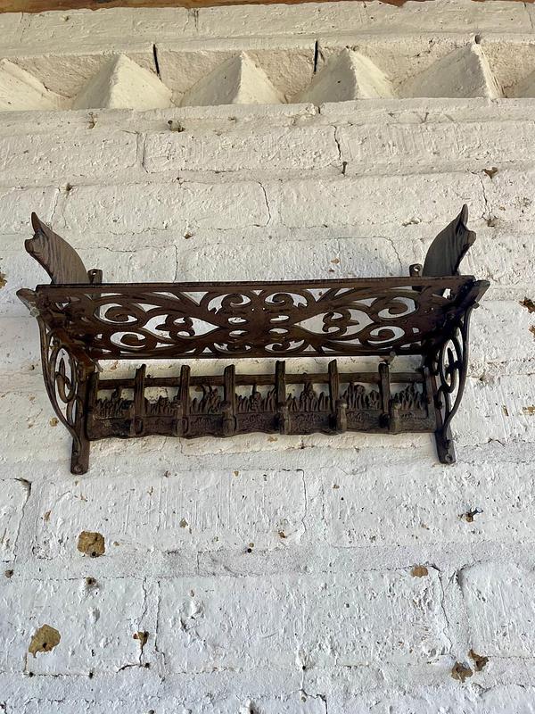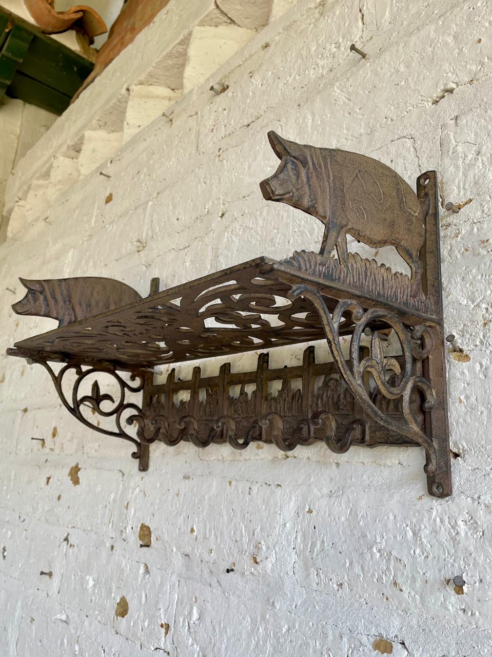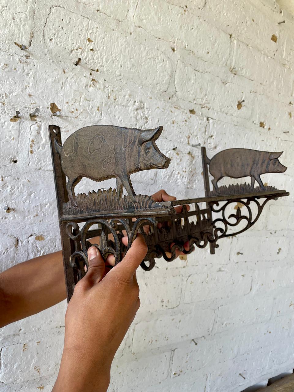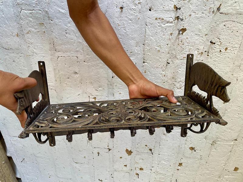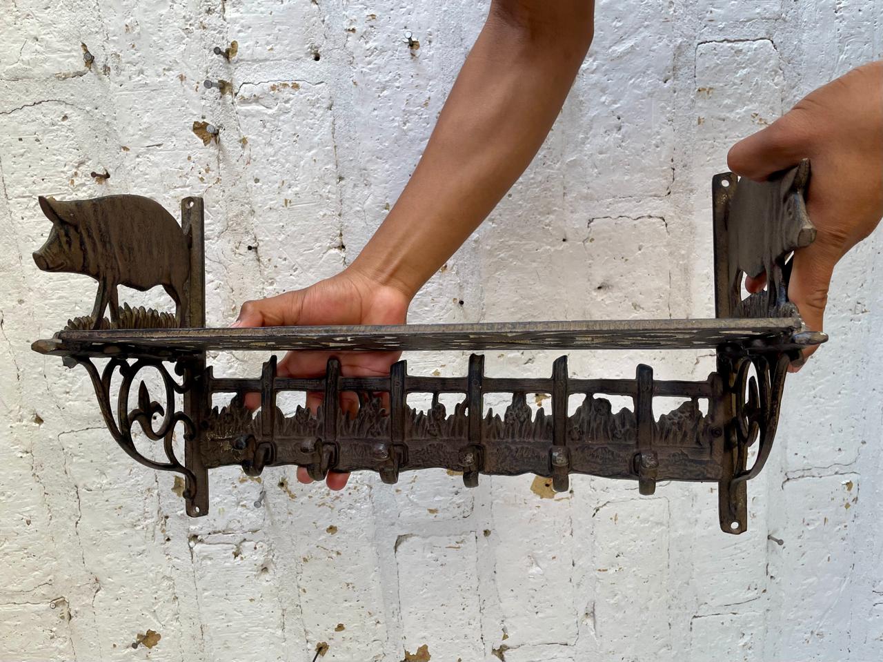 Repisa en hierro fundido con perchero de 6 ganchos en la base, los laterale estan decorados con cerdos, la repisa base está formada por arabescos. Una repisa funcional decorativa de estilo rustico.