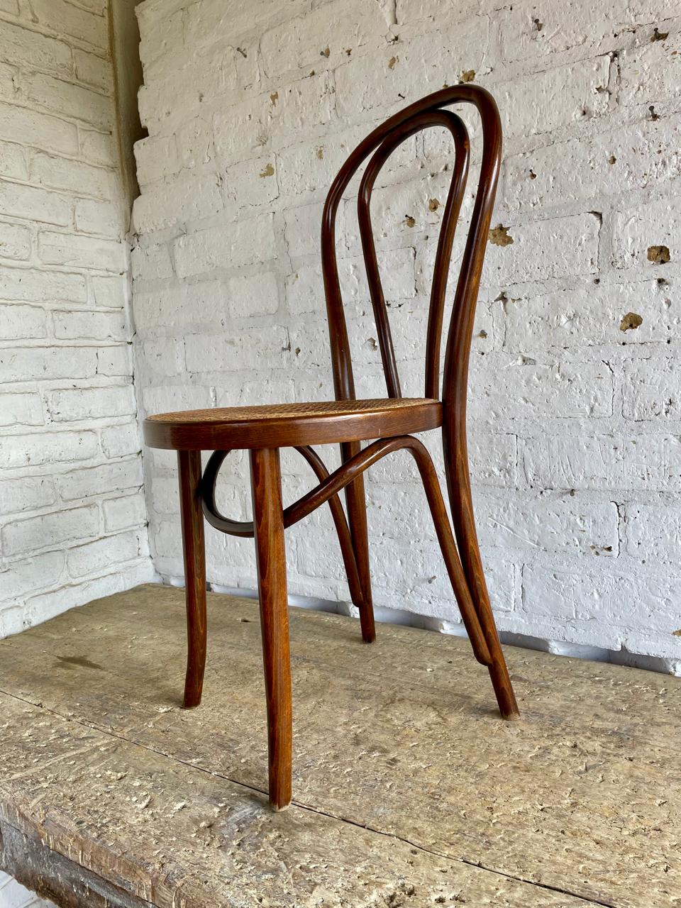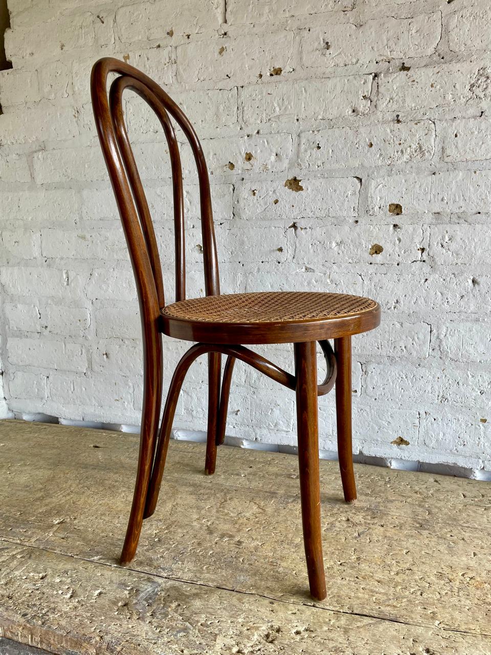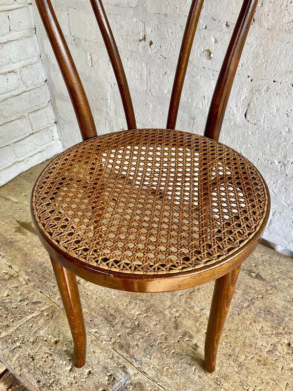 Silla fabricada por artesanos colombianos en los años ochenta con madera doblada al vapor técnica aprendida de maestros europeos, el asiento está tejido en ratán. Se encuentra en buen estado con los desgastes generados por el uso y el paso del tiempo.