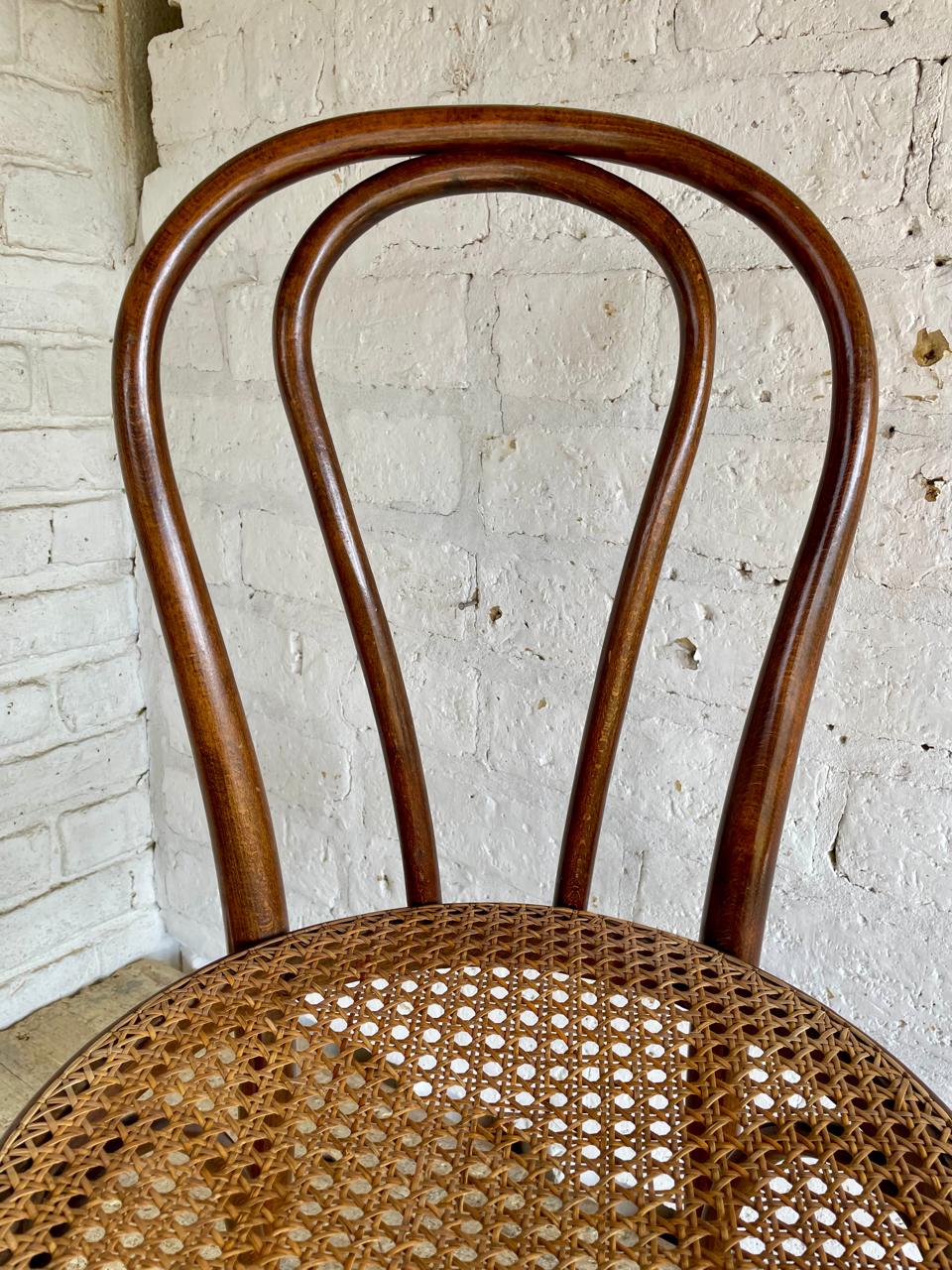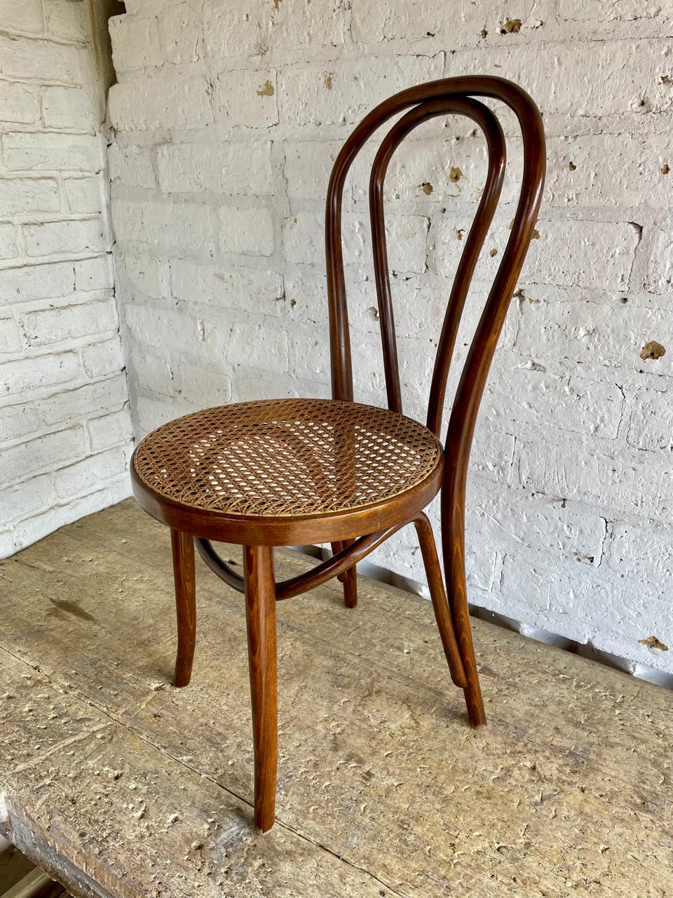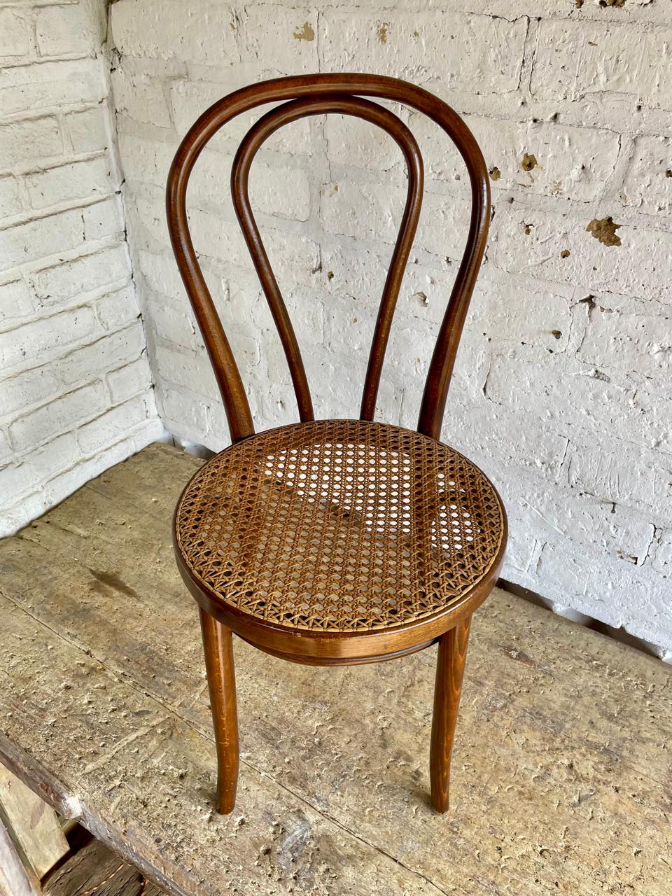 Silla fabricada por artesanos colombianos en los años ochenta con madera doblada al vapor técnica aprendida de maestros europeos, el asiento está tejido en ratán. Se encuentra en buen estado con los desgastes generados por el uso y el paso del tiempo.