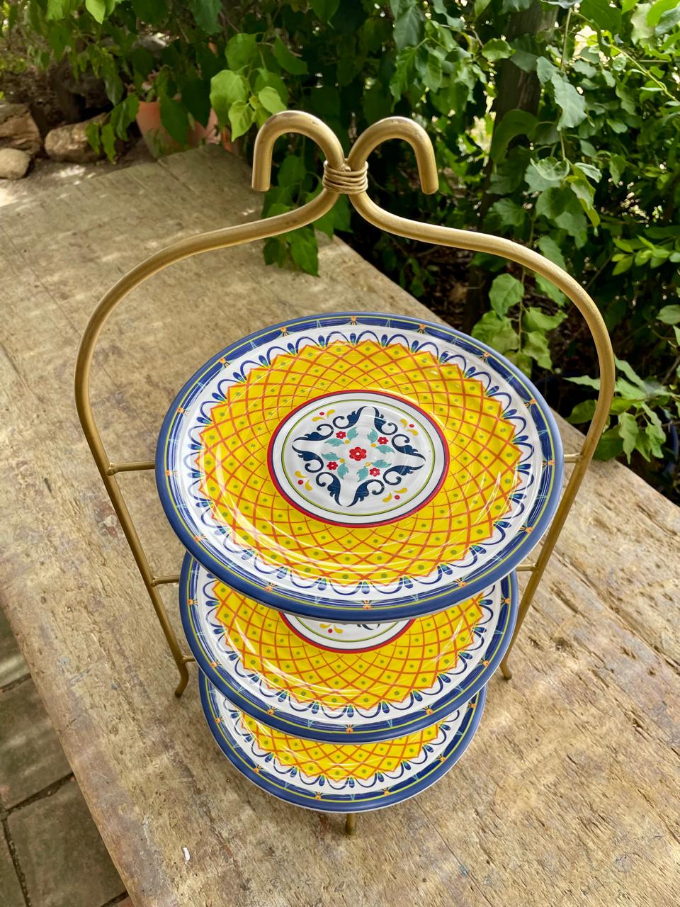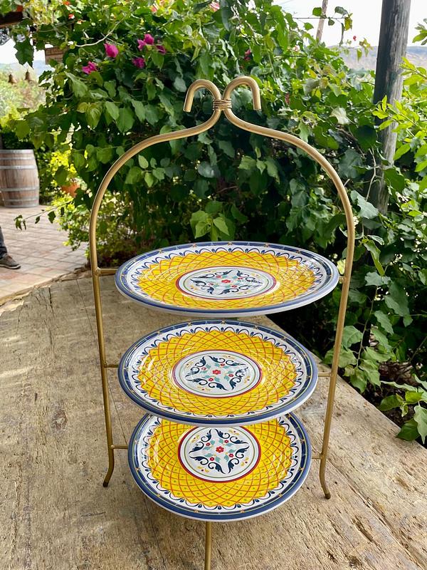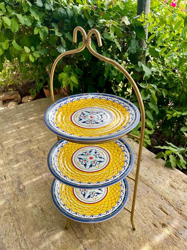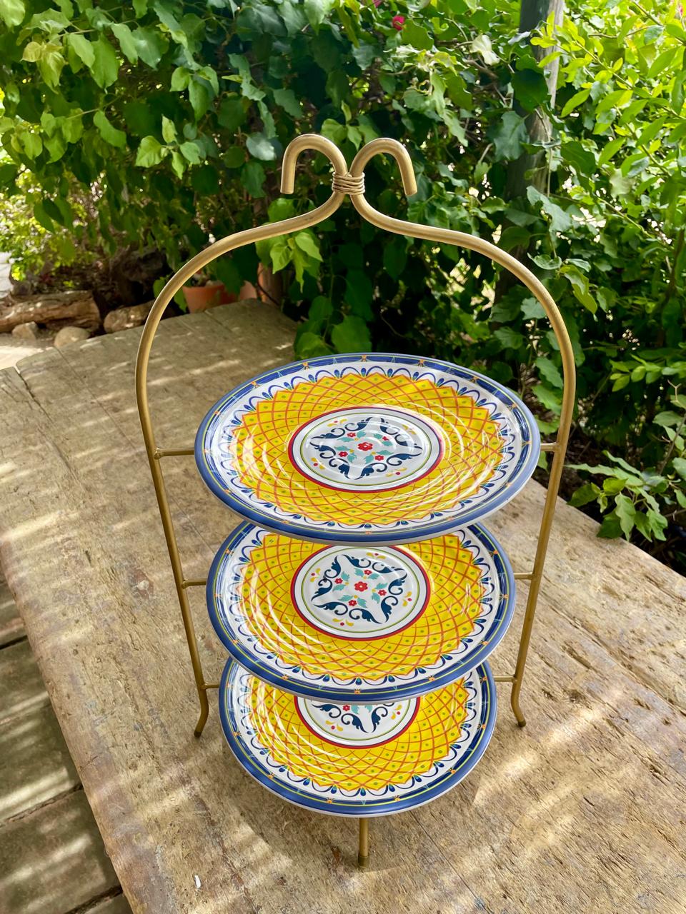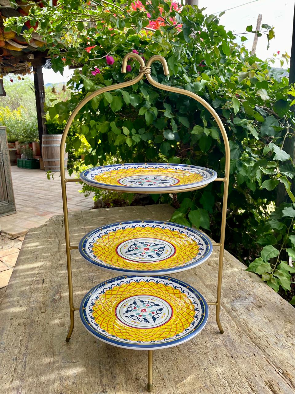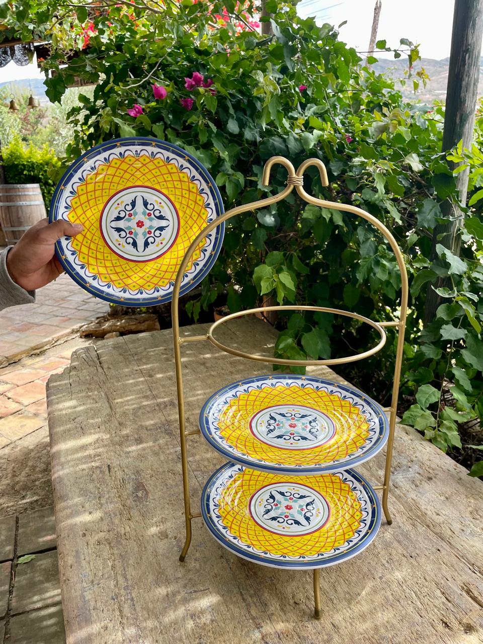 Galletero de 3 niveles con soporte metálico dorado y platos de melamina.