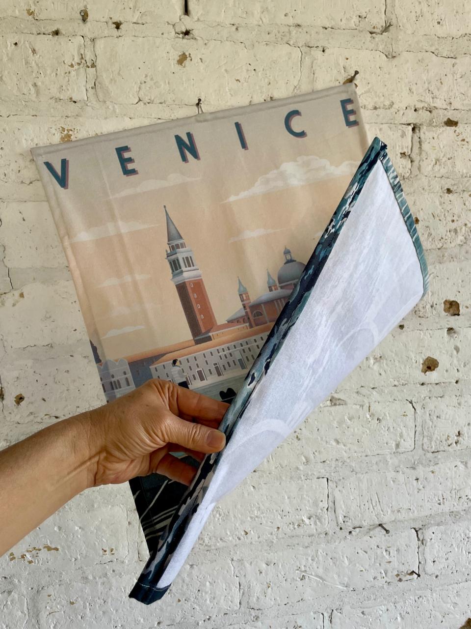 Pendón impreso sobre tela de un antiguo afiche promocional de Venecia. Tiene soportes metálicos en la parte de arriba y de abajo. Se encuentra en buen estado.