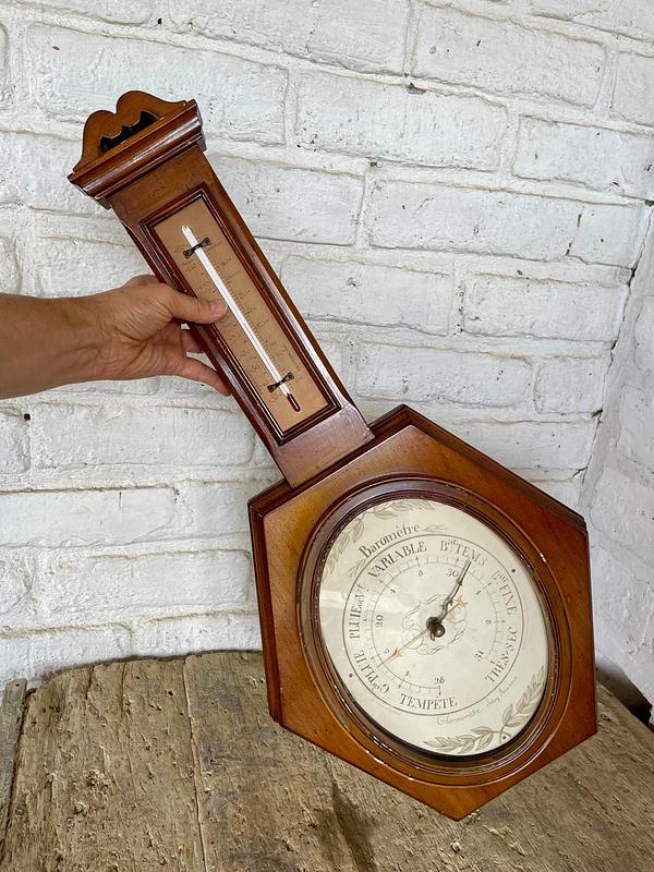 El tablero del barómetro tiene indicaciones en francés como "Tempête" (Tormenta), "Pluie" (Lluvia), "Variable", "B. Temps" (Buen tiempo) y "Très sec" (Muy seco). El termómetro está funcionando, registra grados centígrados y fahrenheit. El barómetro se ve en buen estado, pero se recomienda hacerlo revisar y calibrar por un experto. MEDIDAS: Alto 71 cm. Largo 35 cm. Espesor 5cm.