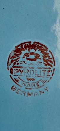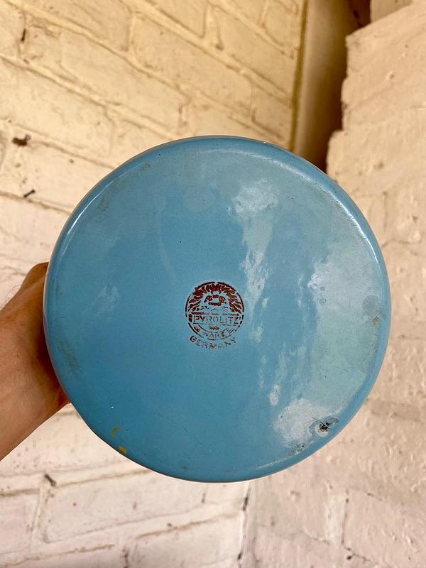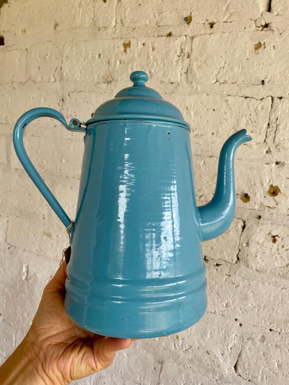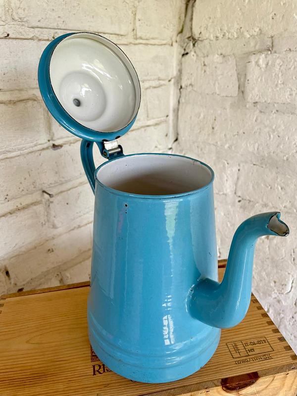 Cafetera de esmalte azul y cuello de cisne de mediados de siglo, década de 1940, fabricada en Alemania. La base tiene estampado el sello PYROLITE WARE GERMANY. Presenta algunas desportilladuras en el esmalte.