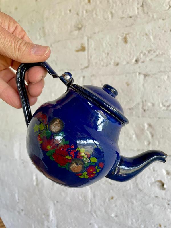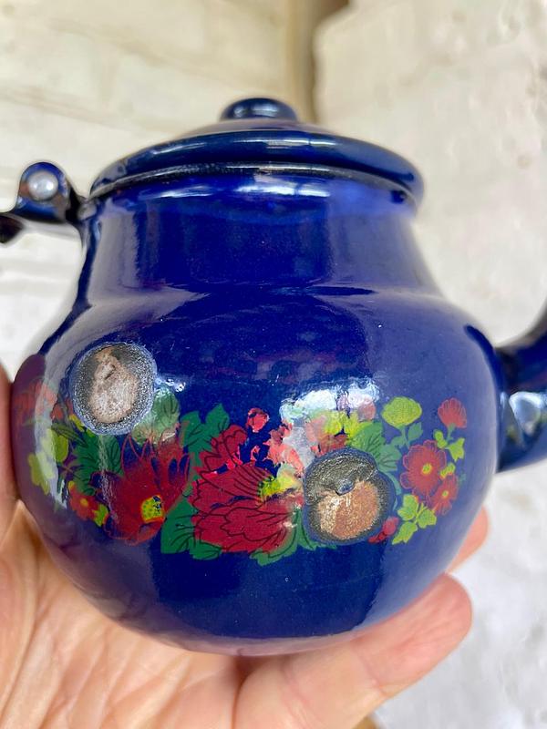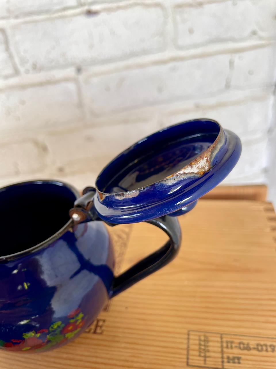 Pequeña tetera metálica recubirerta con esamalte horneado azul y decorada con flores de los años 60. Presenta desmaltaduras.