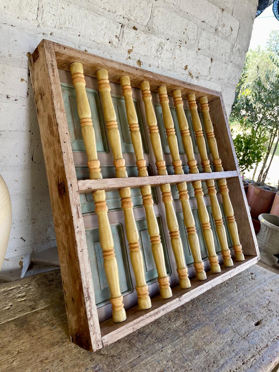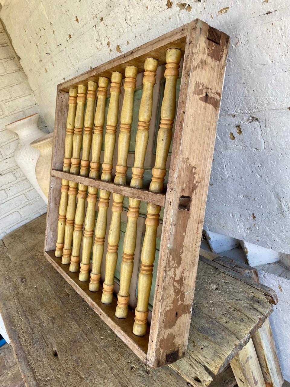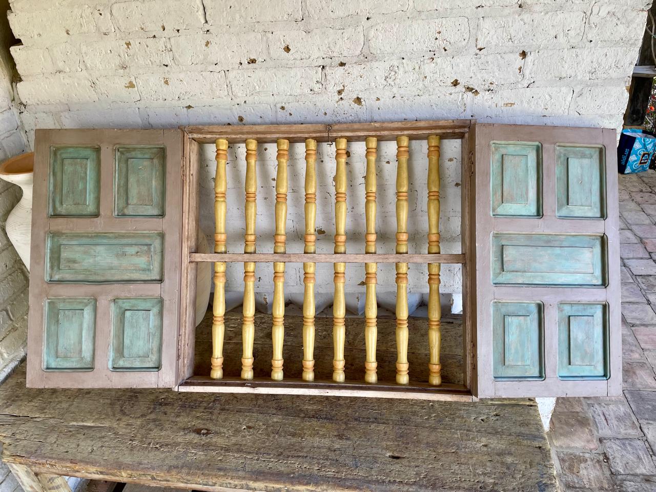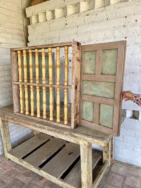Ventana de carpintería artesanal colombiana, recuperada de la demolición de una casa de principio del S XX. Su diseño no solo era funcional para la ventilación y seguridad, sino que también servía como un importante elemento decorativo de la fachada. Fabricada en madera maciza con marco robusto, dos puertas abatibles, reja con balaustres torneados y travesaño central que refuerza la estructura y añade equilibrio al diseño. Tiene el desgaste del tiempo, se encuentra en buen estado, libre de termitas y carcomas.