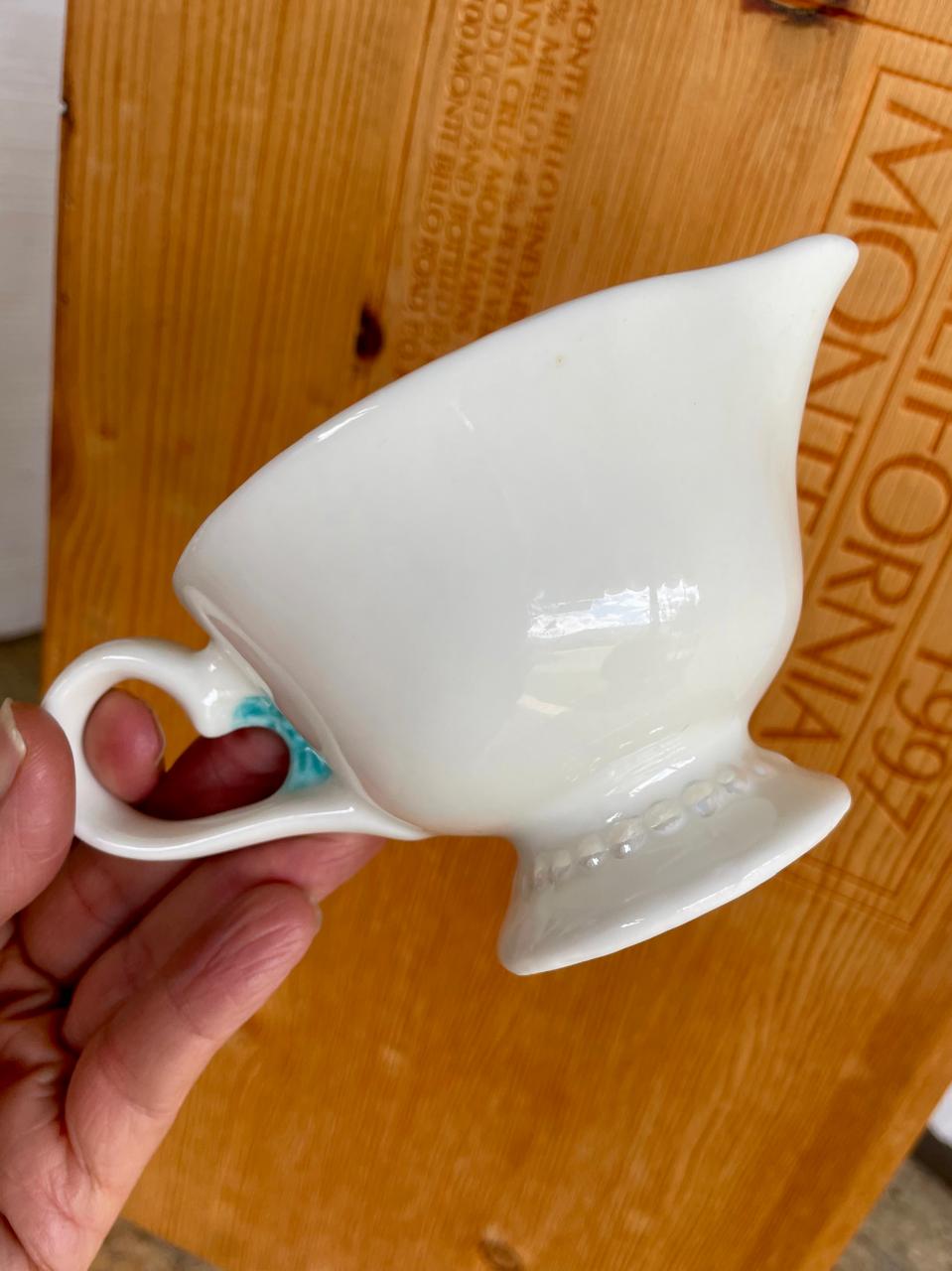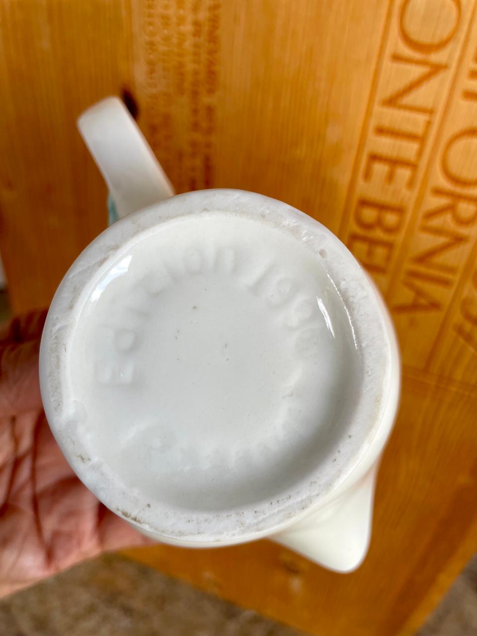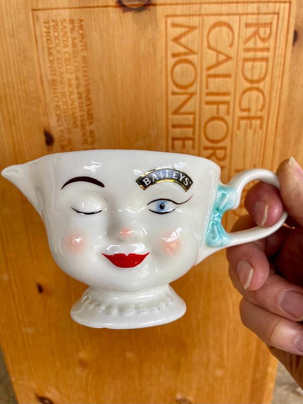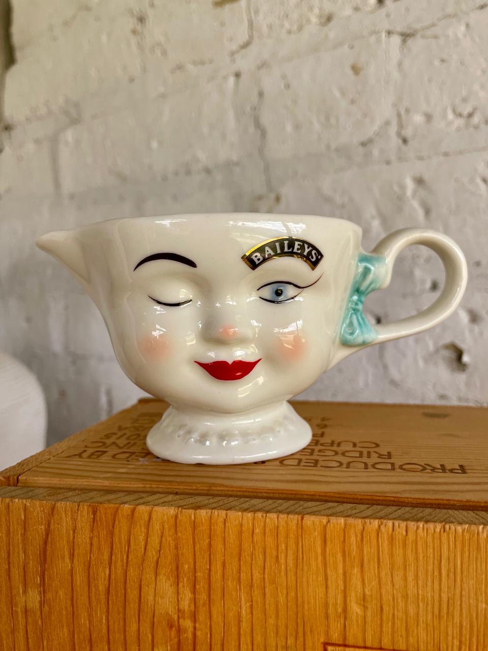 Taza con pico vertedor o dispensador de crema de edición limitada de Baileys Irish Cream de 1996, conocida como la taza "Yum Face". Elaborada en cerámica esmaltada blanca con un diseño de cara sonriente y guiñando un ojo, con mejillas sonrojadas y labios rojos. El logotipo de Baileys se encuentra sobre el ojo izquierdo, funcionando como una ceja. Presenta un lazo azul en el asa y un detalle de "collar de perlas" en la base. La palabra "Yum" está impresa en el interior de la taza. Esta pieza es un artículo coleccionable popular para los entusiastas de la marca. Se encuentra en perfecto estado.